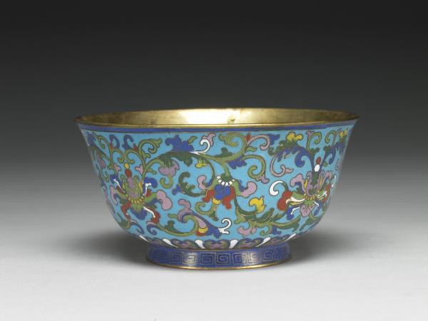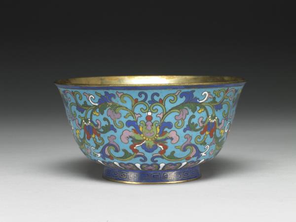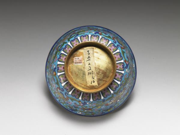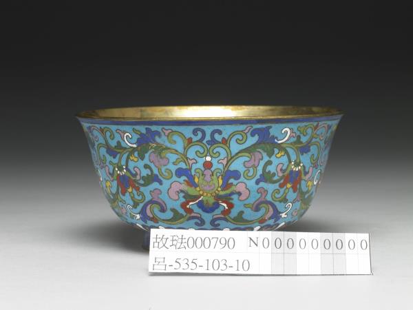 銅胎,敞口微撇,深弧壁略斂,圈足。器身淺藍地,以掐絲技法製作花紋。器外壁滿飾纏枝番蓮花,或盛開、或含苞,花葉色調多樣,有繁盛之趣。近足蓮瓣紋一圈。足牆外壁深藍地回紋,足內露胎,光素無款。