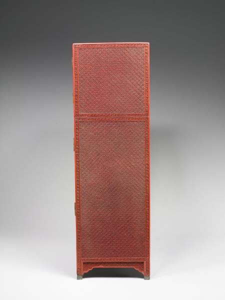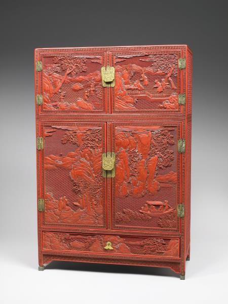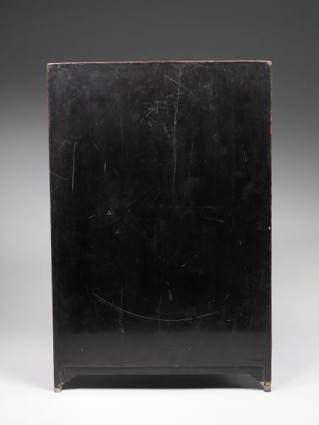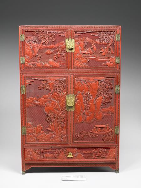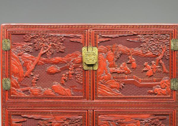 | 說明 | 剔紅長方形小櫃,色硃紅,醇厚有光澤,邊角略有傷損。立式小櫃,分三層,上與中層為對開式門,中層較大層櫃上方設有空格,內有暗屜,下層作抽屜,底有四如意形足,嵌銅鎖、合頁與鈕頭。櫃面共有五個開光,以回紋為邊框,雕山林水泊間遊人景致,頂與二側面則飾繡球朵花錦地。櫃裡與背髹黑色光漆。 |
