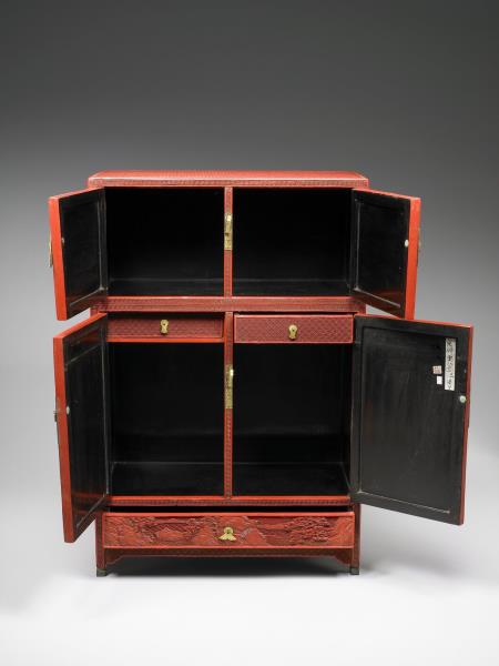 剔紅長方形小櫃,色硃紅,醇厚有光澤,邊角略有傷損。立式小櫃,分三層,上與中層為對開式門,中層較大層櫃上方設有空格,內有暗屜,下層作抽屜,底有四如意形足,嵌銅鎖、合頁與鈕頭。櫃面共有五個開光,以回紋為邊框,雕山林水泊間遊人景致,頂與二側面則飾繡球朵花錦地。櫃裡與背髹黑色光漆。