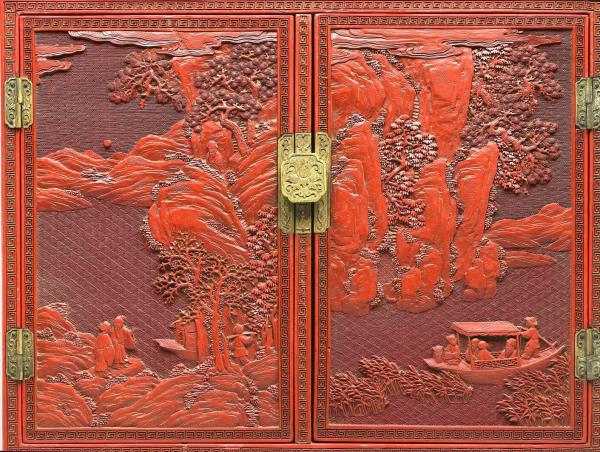 Carved-red lacque cabinet with decoration of "The Red Cliff" |