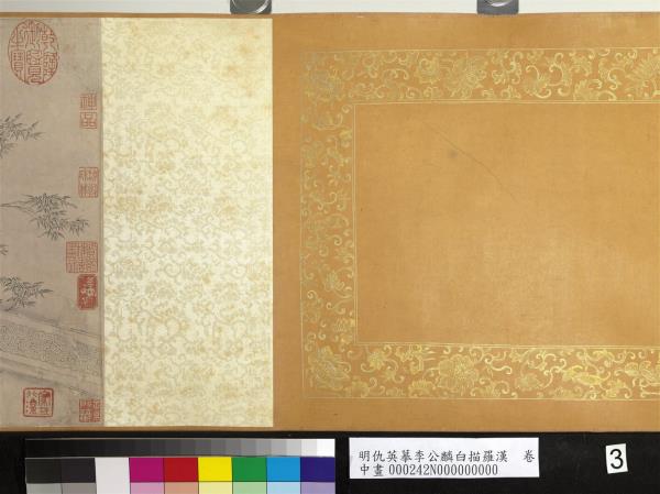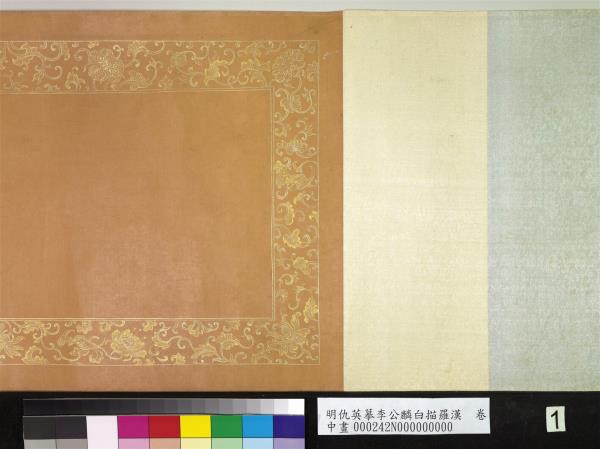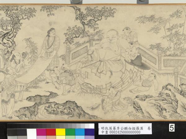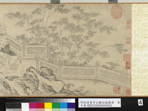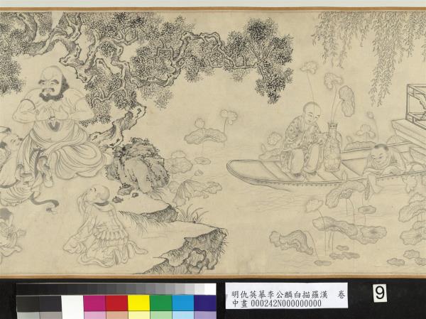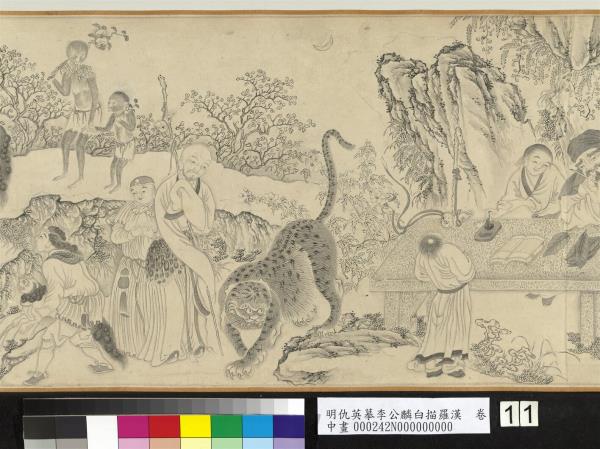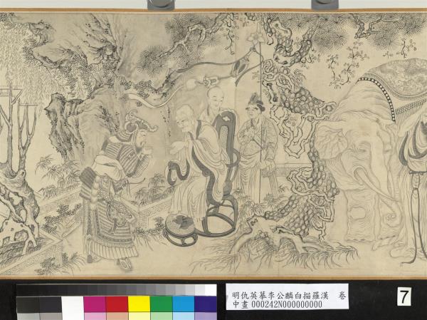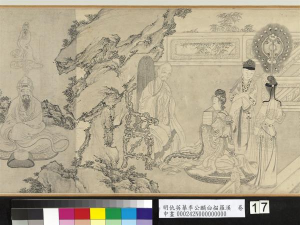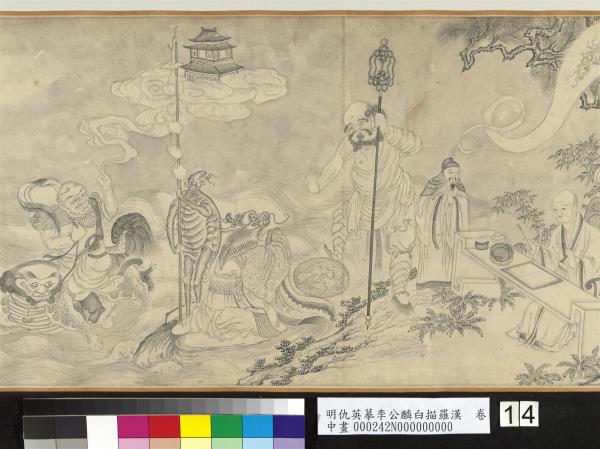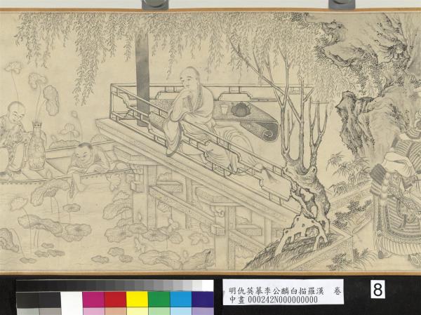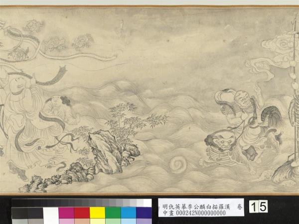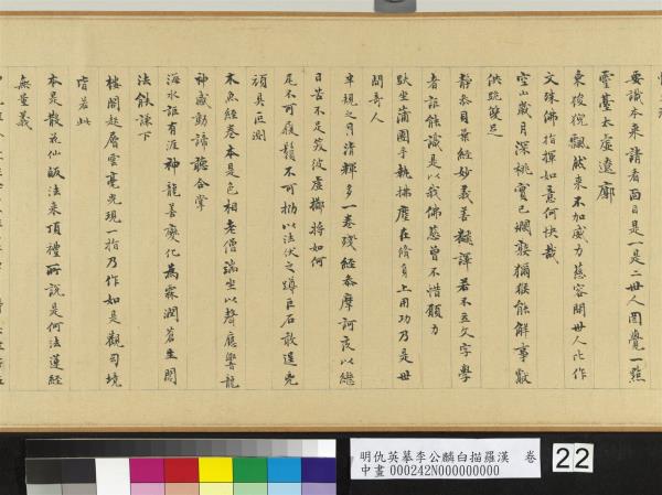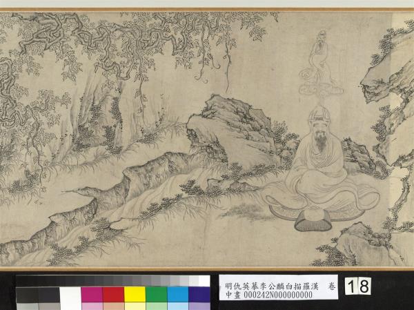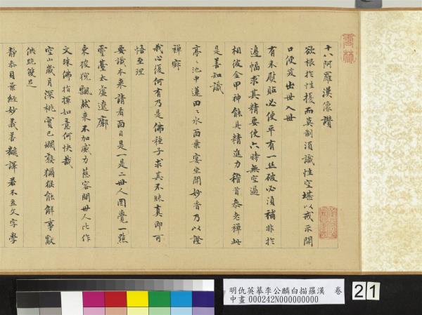 十八阿羅漢像讚。欲根於性。擾而莫制。須識性空。堪以戒示。開口便笑。出世入世。有未熨貼必使平。有一絲破必須補。非於邊幅求其精。要使六時無空過。相彼金甲神。能具精進力。稽首參老禪。此是善知識。亭亭池中蓮。田田水面葉。宴坐聞妙香。乃以證禪寂。我心復何有。乃是佛種子。求其不昧真。即可悟至理。要識本來。請看面目。是一是二。世人罔覺。一點靈臺。太虛遼廓。乘狻猊飄然來。不加威力慈容開。世人比作文殊佛。指揮如意何快哉。空山歲月深。桃實已爛熟。獮猴能解事。獻供跪雙足。靜參貝葉經。妙義善飜譯。若不立文字。學者詎能識。是以我佛慈。曾不惜願力。趺坐蒲團。手執拂塵。在修身上用功。乃是世閒奇人。半規之月清輝多。一卷殘經參摩訶。夜以繼日苦不足。笑彼虛擲將如何。尾不可履。鬚不可(扌阞)。以法伏之蹲巨石。敢逞兇頑具叵測。木魚經卷。本是色相。老僧端坐。以聲應響。龍神感動。諦聽合掌。海水詎有涯。神龍善變化。為霖潤蒼生。聞法能謙下。樓閣起層雲。毫光現一指。乃作如是觀。幻境皆若此。本是散花仙。皈法來頂禮。所說是何法。蓮經無量義。神光離合處。非實亦非虛。禪宗得真性。所在現如如。行深靡不成。中止良可惜。企彼面壁人。九年如一日。嘉靖十六年春二月三橋文彭敬書。 |