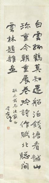 | 釋文 | 白雲孤鶴莫知還。船泊錢塘看越山。珍重今朝重展卷。吟詩作賦北牕間。雲林題雜畫。敬之我兄法家正。于右任。 |
