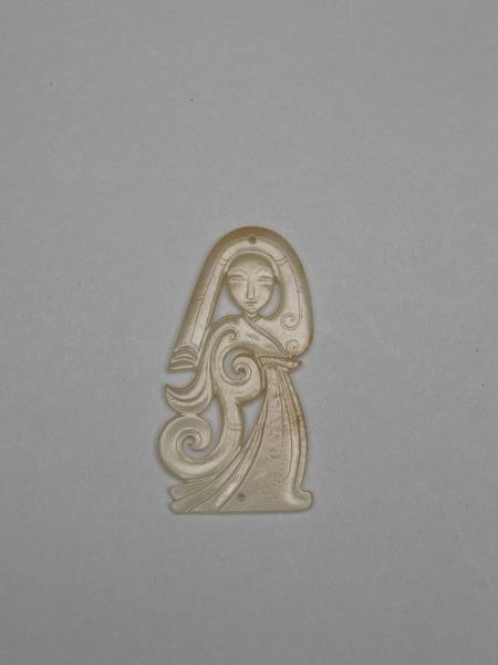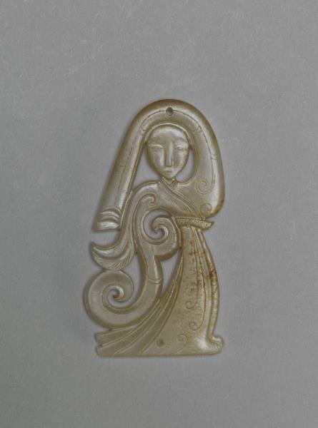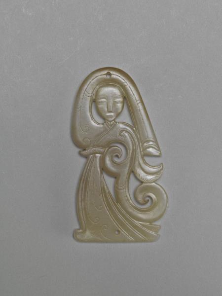 玉質,局部微微受沁。玉人製作精緻,看似平面,其實眉宇五官深淺有致,衣袖和裙襬則利用凹弧起伏的層疊形式,創造出輕薄透亮、層次分明的視覺效果。由上方穿孔可知玉人為佩飾,多是組玉佩之中的組件。