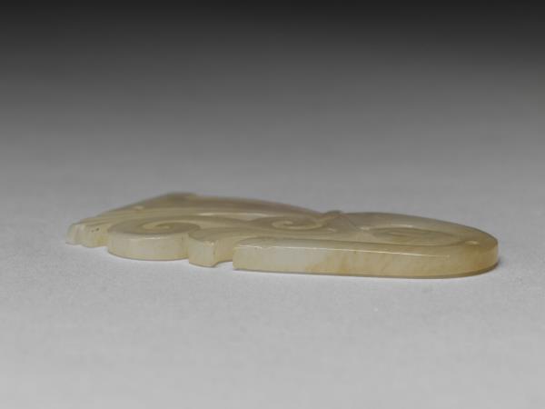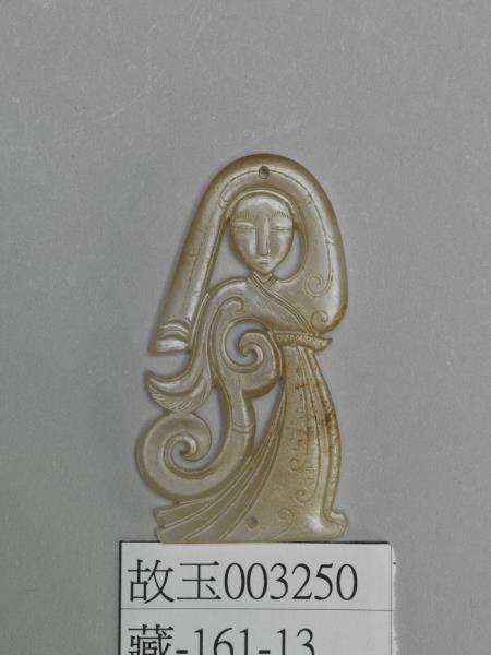 | 說明 | 玉質,局部微微受沁。玉人製作精緻,看似平面,其實眉宇五官深淺有致,衣袖和裙襬則利用凹弧起伏的層疊形式,創造出輕薄透亮、層次分明的視覺效果。由上方穿孔可知玉人為佩飾,多是組玉佩之中的組件。 |
