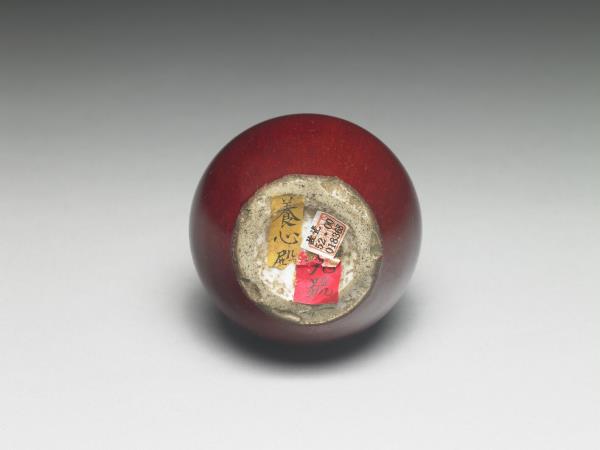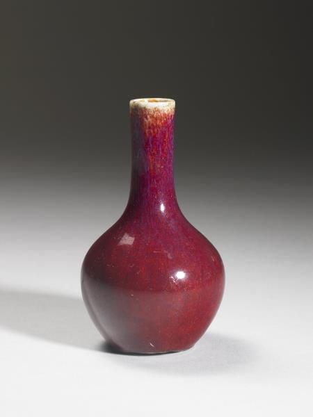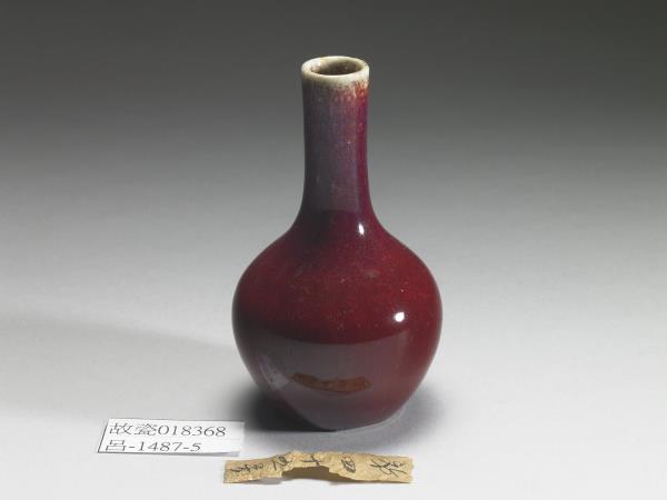 直口,長頸,斜肩,斂腹,凹足。全器施爐鈞釉,整體呈紅色,帶有些許藍色斑點,口沿因流釉而呈白色。足底露胎,呈灰褐色,孔隙多,底施白釉,貼有「養心殿」黃籤。