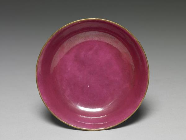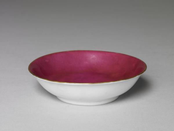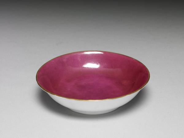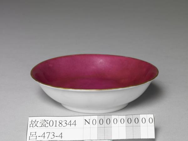 微撇口,深壁,平底,圈足。內壁施胭脂紅釉,外部施透明釉,口沿施一圈金釉。底有紅書「洪憲年製」四字雙行楷款,與故瓷18343為一對。