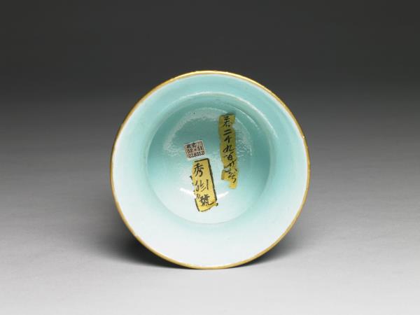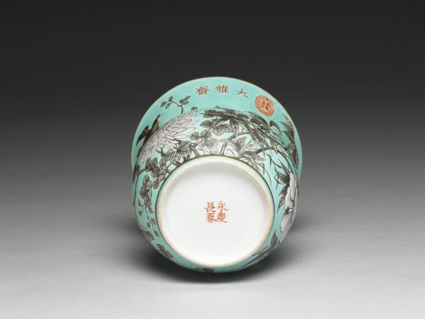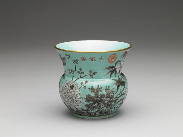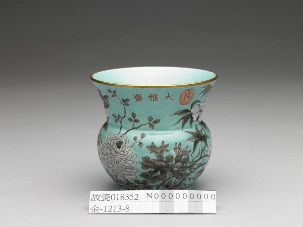 | 說明 | 侈口,器作渣斗形,碩腹,圈足。器內淺綠釉,器外壁以深淺不一的黑色釉效果,模仿水墨勾勒菊花等花卉為飾,隙地罩與器內同色之淺綠釉。其頸部有「大雅齋」紅楷字、「天地一家春」印記,加上足內白釉地紅字「永慶長春」楷款,為供給慈禧皇后御用的器物。 |