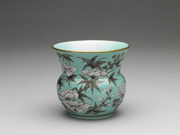 侈口,器作渣斗形,碩腹,圈足。器內淺綠釉,器外壁以深淺不一的黑色釉效果,模仿水墨勾勒菊花等花卉為飾,隙地罩與器內同色之淺綠釉。其頸部有「大雅齋」紅楷字、「天地一家春」印記,加上足內白釉地紅字「永慶長春」楷款,為供給慈禧皇后御用的器物。