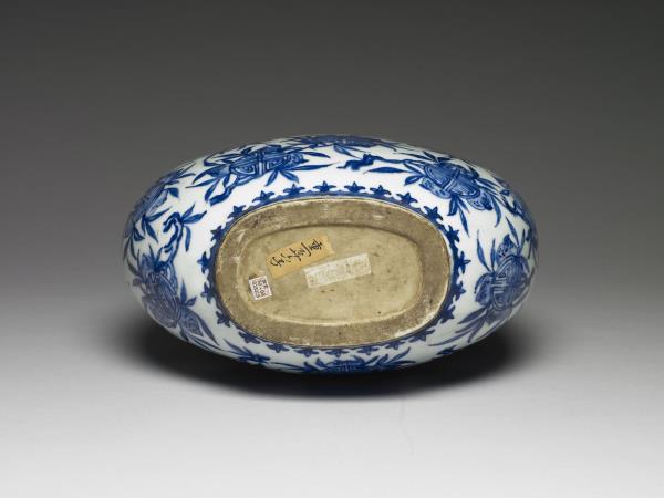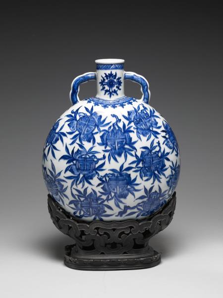 圓口,直頸,兩聳耳,扁圓腹,橢圓圈足。通體施白釉,上繪青花紋飾,底部露胎。口緣與肩飾三角紋帶,腹面佈滿團壽形,壽字外緣環繞壽桃與捲曲翻轉之葉片。帶木座。