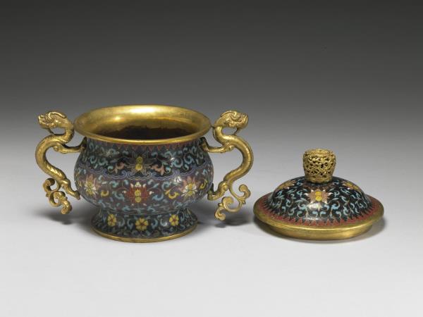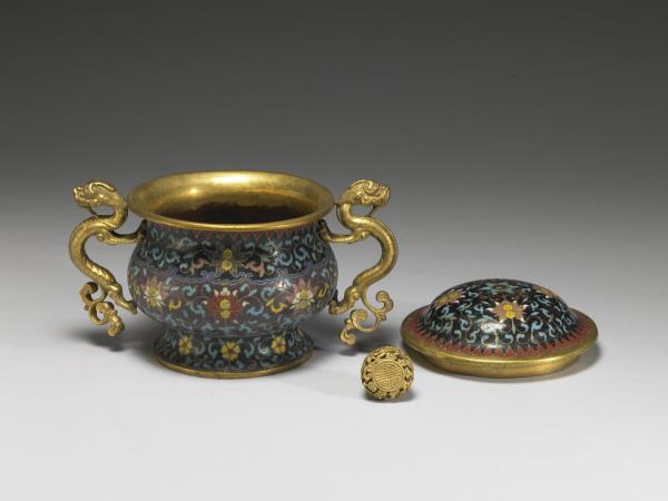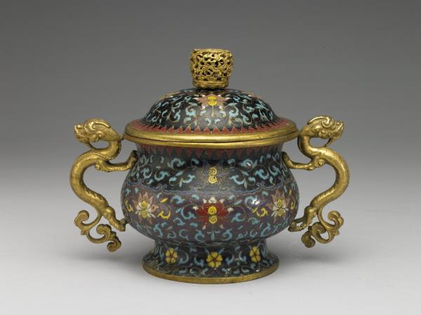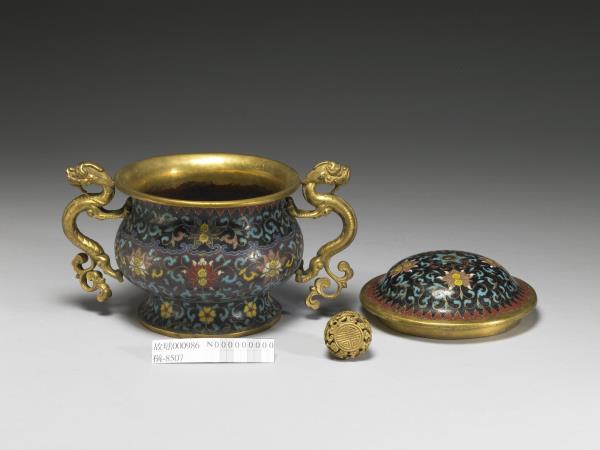 撇口,束頸,雙顧首龍耳,鼓腹,撇圈足,帶鏤空雲紋鈕之穹頂蓋,鈕頂飾團壽字。器腹為深紫地,其餘部份為深藍地,以掐絲技法於蓋緣與口緣飾如意雲紋,腹與蓋面飾番蓮紋,足飾五瓣花紋。
