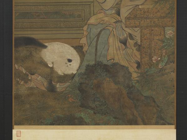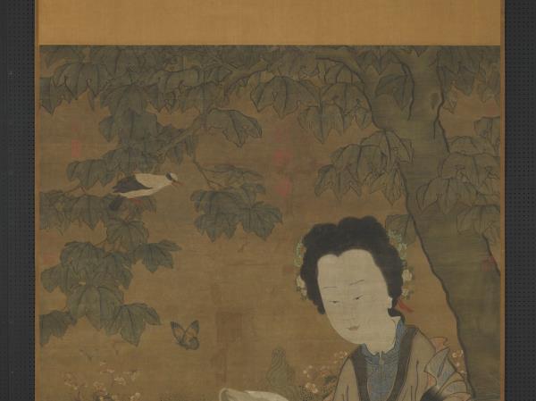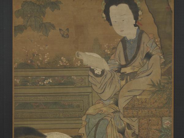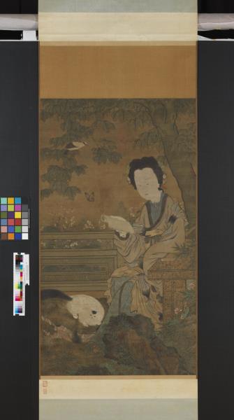 Chou Wen-ch', a native of Ch'-jung, Chien-k'ang (modern Nan-king), served the Southern T'ang ruler Li Yu as a Painter-in-Attendance at the Hanlin Academy. He excelled at paintings elaborate costumes and carriages, but was famous for his figure paintings, especially those of women. These he drew with delicate twisting, segmented lines of great fullness and fluidity, sometimes employing a graceful, waving line. He did not just merely slavishly emulate the styles of the famous painters Wu Tao-tzu (fl. ca. 710-760) or Ts'ao Pu-hsing (fl. third century) but created his own unique manner. His paintings of beautiful women reflect the influence of Chou Fang (fl. 780-804) but are even lovelier and finer than his. In the shade of a firmiana tree a young woman, a cat by her side, casually leans against a balustrade, reading a book. The painting does not bear the artist's signature and was probably given its current attribution by a later collector. In terms of brushwork, the forceful turning and twisting lines that model the woman's robes are far from Chou-ch's style.