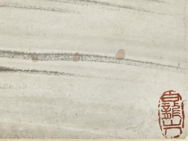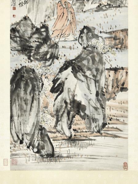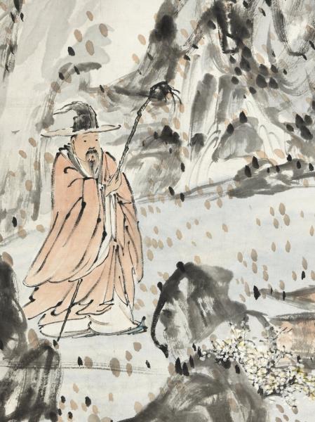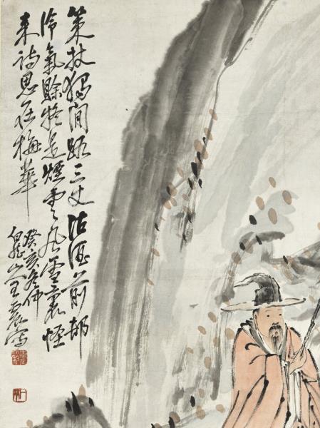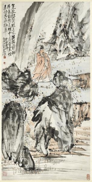 本幅為蔡辰男先生捐贈,運雄健之筆,寫怪石流泉,梅華夾道,士人戴笠,獨行其間。此幀賦色簡淡,然墨彩交融,點染隨興,自成一派恣肆生動的意趣。