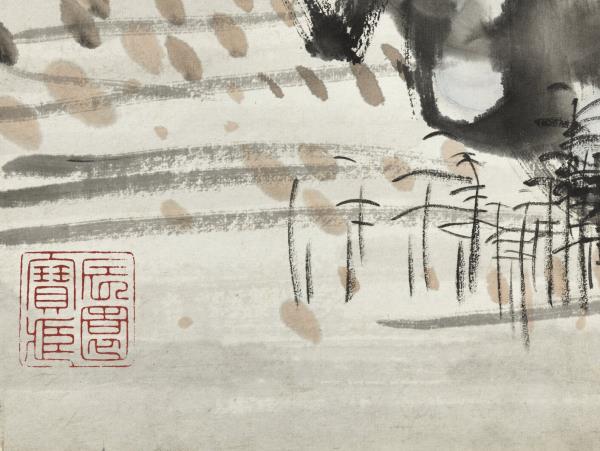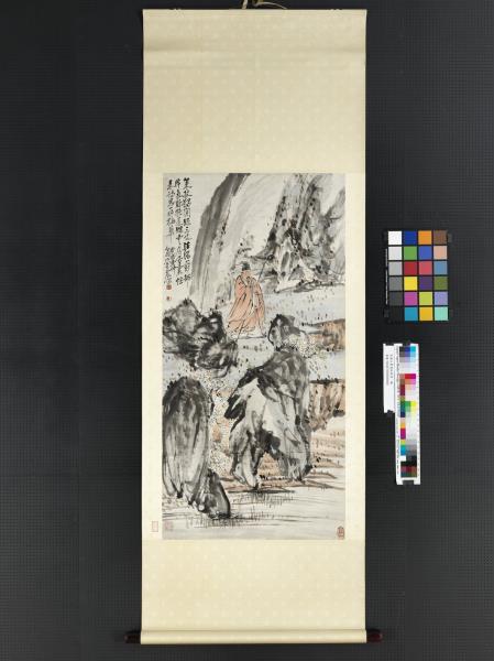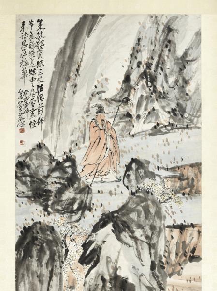 本幅運雄健之筆,寫怪石流泉,梅華夾道,士人戴笠,獨行其間。雖賦色簡淡,然墨彩交融,點染隨興,自成一派恣肆生動的意趣。本幅為蔡辰男先生捐贈。