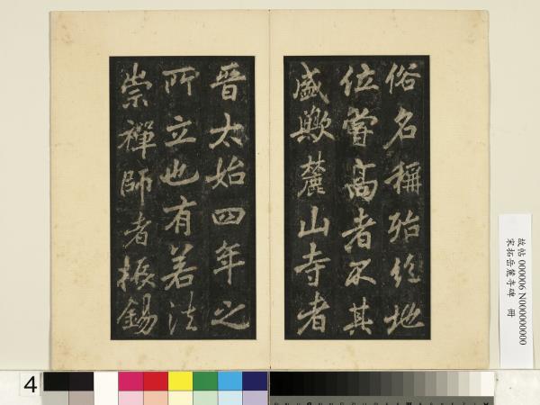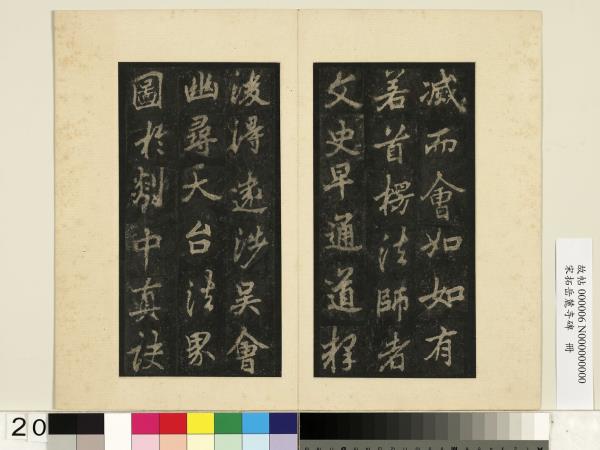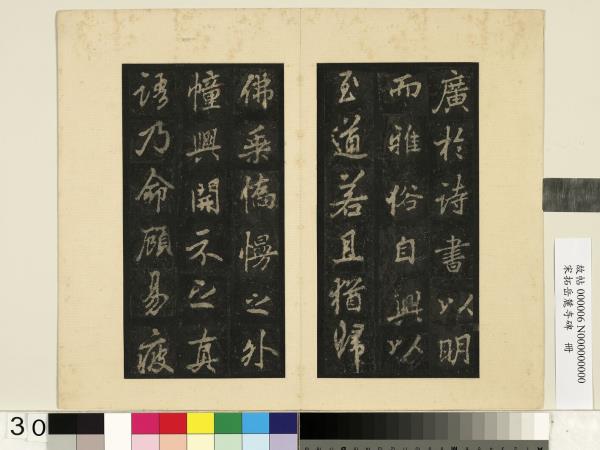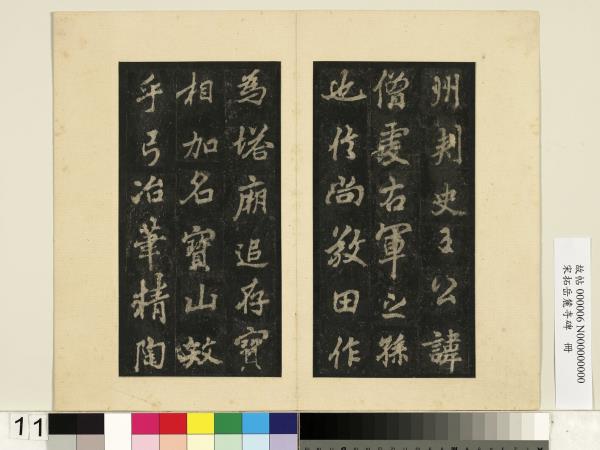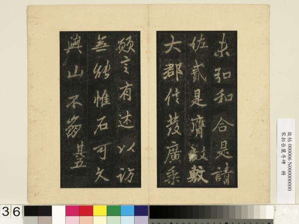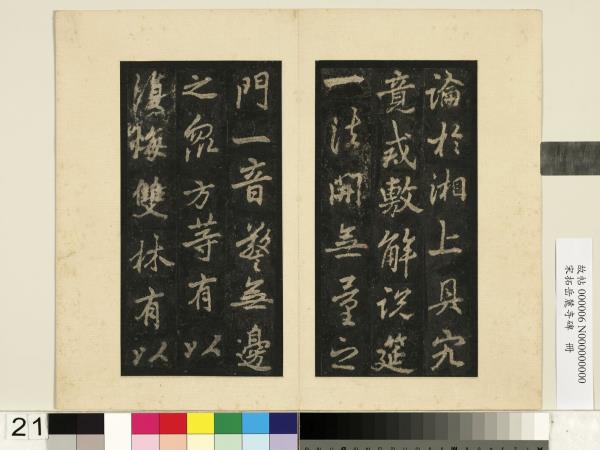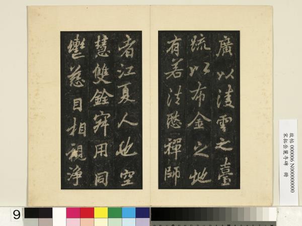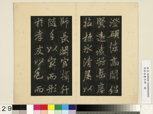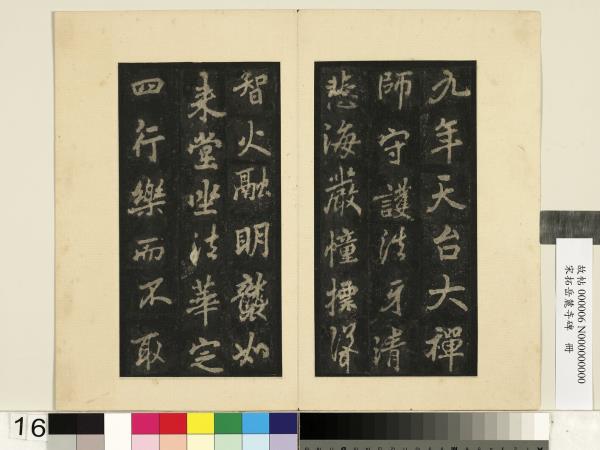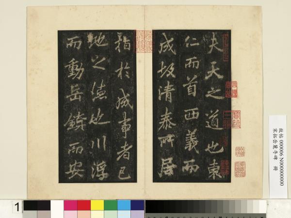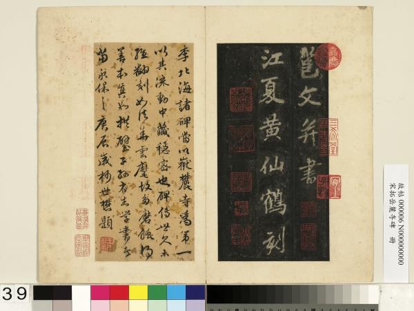 (善本書影箋。故宮博物院製)余藏宋拓岳麓寺碑二。所見則十餘本。以王夢樓李春湖陶雲汀何子真王廉生端午橋。趙聲伯寶瑞臣為最精。然墨色字口均不及此本之佳。此本不僅贊句諸全。江夏黃仙鶴刻六字不褱。即第二十四頁之冥搜息想搜字。三十二頁之道成西域域字亦絲豪無損。尤為諸本所不及。早秊講習岳麓。寶鄰此碑。晨夕捫娑。亟改馨仰。民國二秊春。山水洪發。壁裂欲傾。又為興工築砌。位置鞏固。竝于折卸時拓其碑。長數十紙。碑長楷法。凝重與端州石室記正同。惜半毀于宋明人。題刻所存尚百數十字耳。此本為畢靈巖舊藏。王夢樓跋記甚詳。靈巖身後設籍。所收文物均抄入內府。此其一也。右軍如龍。北海如虎。昔人評之屢矣。其寔北海出自會稽。寀其鈎勒撇畫原流。一望而知。謂為北法。冤哉枉矣。倭氛警卒。來日大難。故宮荷葆藏有學在四夷之感。爰用珂版印行。公之重北海書者。民國二十二年(西元一九三三年)春。易培基記。 |