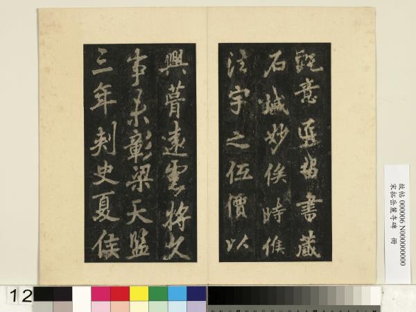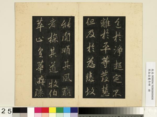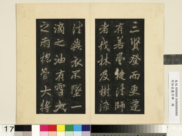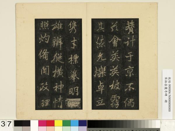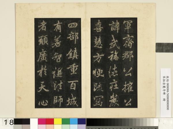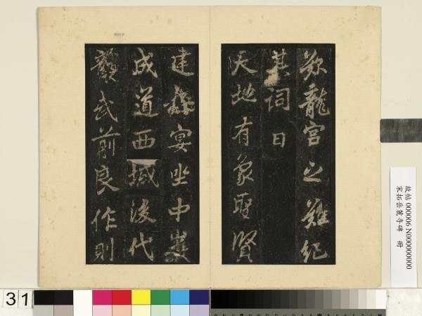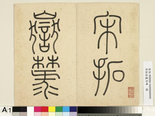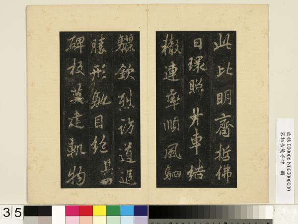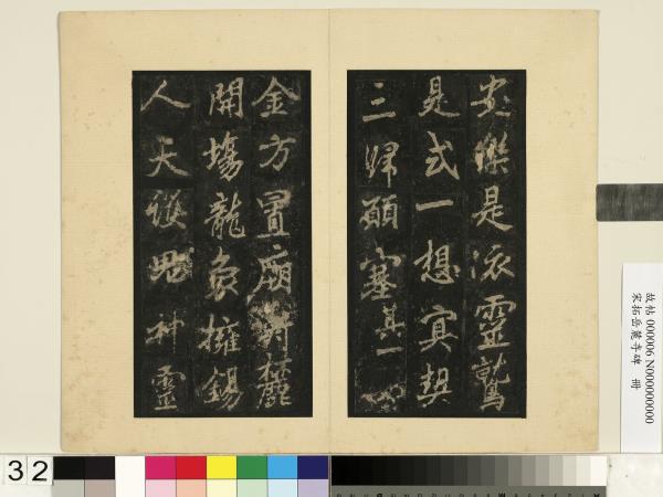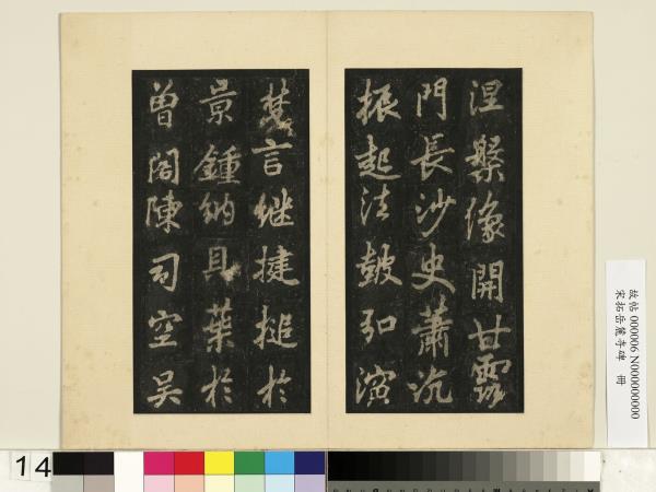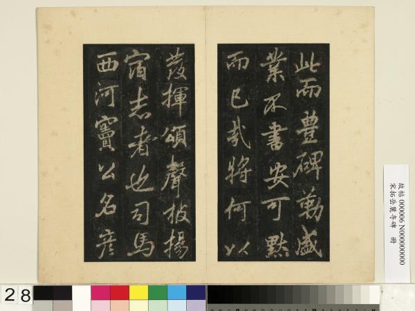 (善本書影箋。故宮博物院製)余藏宋拓岳麓寺碑二。所見則十餘本。以王夢樓李春湖陶雲汀何子真王廉生端午橋。趙聲伯寶瑞臣為最精。然墨色字口均不及此本之佳。此本不僅贊句諸全。江夏黃仙鶴刻六字不褱。即第二十四頁之冥搜息想搜字。三十二頁之道成西域域字亦絲豪無損。尤為諸本所不及。早秊講習岳麓。寶鄰此碑。晨夕捫娑。亟改馨仰。民國二秊春。山水洪發。壁裂欲傾。又為興工築砌。位置鞏固。竝于折卸時拓其碑。長數十紙。碑長楷法。凝重與端州石室記正同。惜半毀于宋明人。題刻所存尚百數十字耳。此本為畢靈巖舊藏。王夢樓跋記甚詳。靈巖身後設籍。所收文物均抄入內府。此其一也。右軍如龍。北海如虎。昔人評之屢矣。其寔北海出自會稽。寀其鈎勒撇畫原流。一望而知。謂為北法。冤哉枉矣。倭氛警卒。來日大難。故宮荷葆藏有學在四夷之感。爰用珂版印行。公之重北海書者。民國二十二年(西元一九三三年)春。易培基記。 |