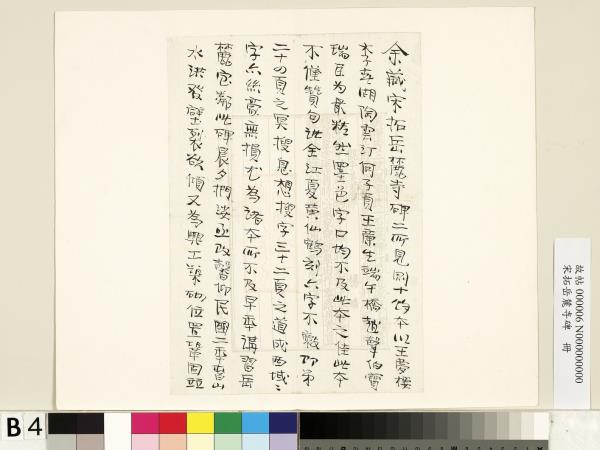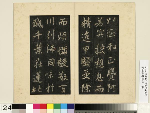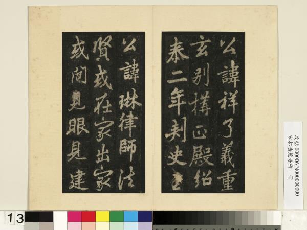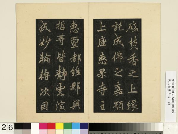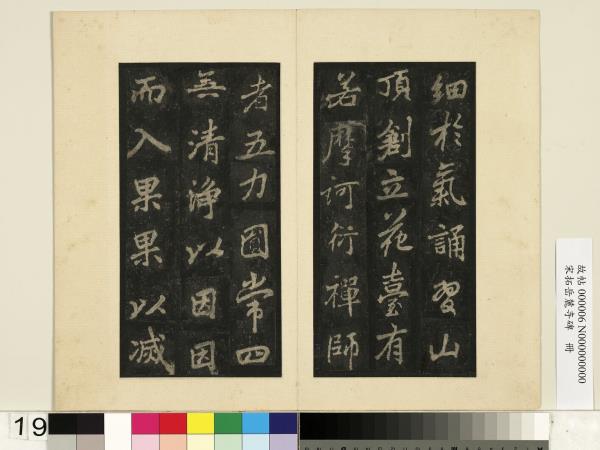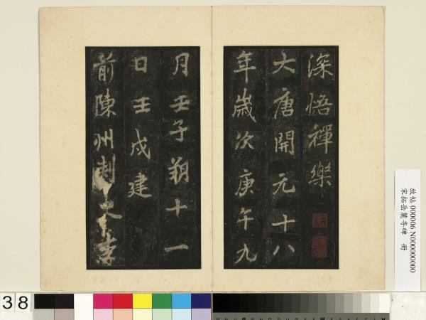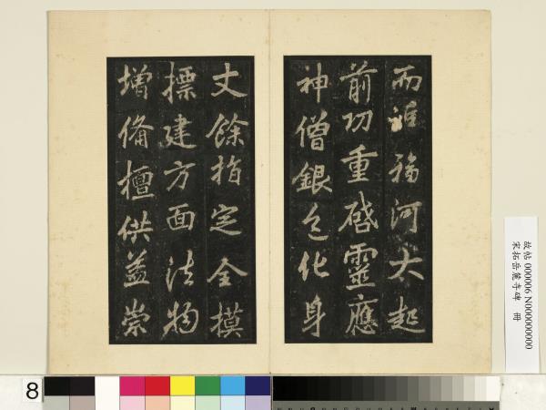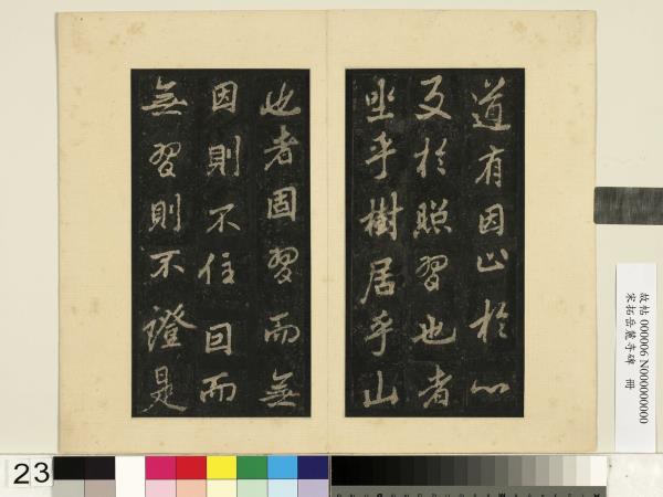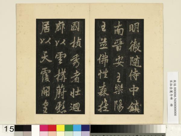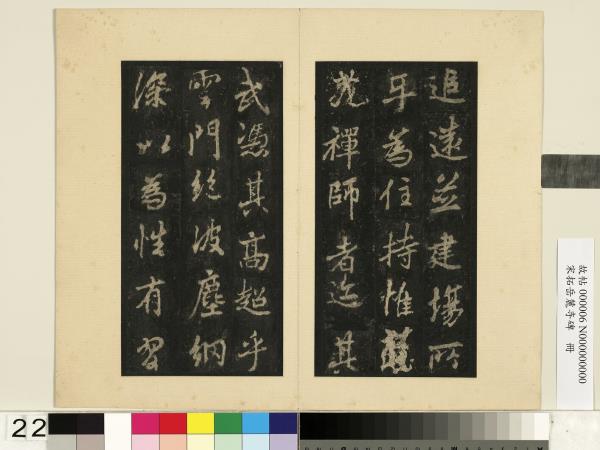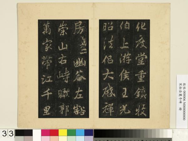 (墨搨李邕書岳麓寺碑二百六行。)夫天之道也。東仁而首。西義而成。故清泰所居。指於成事者已。地之德也。川浮而動。岳鎮而安。故耆□(闍)所□(臨)。取於安定者己。茲寺大柢。厥旨玄同。是以迴向度門。躔于郭右。仰止浄域。列乎巖巔。寶堂岌嶪於太虛。道樹森捎於曾渚。無風而林壑肅穆。不月而相事澄明。化城未真。梵天猶俗。名稱殆絕。地位嘗高者。不其盛歟。麓山寺者。晉太始四年之所立也。有若法崇禪師者。振錫江左。除結與炎漢太宗。長沙清廟。棟宇接近。雲霧晦冥。□(赤)豹文狸。女蘿薜帶。山祇見於法眼。竇后依於佛光。至請舊居。特為新寺。禪師洎翌弘聚謀。介眾表之。明詔行矣。水臬有制。丘墟盡平。太康二載。有若法導禪師。莫知何許人也。默受智印。深入證源。心本無作。真性而見。不壞外緣。而□(注)福河。太起前功。重啟靈應。神僧銀色。化身丈餘。指定全摸。摽建方面。法物增備。擅供益崇。廣以淩雲之臺。疏以布金之地。有若法愍禪師者。江夏人也。空慧雙銓。寂用同轡。慈目相視。淨心相續。綜竅萬法。安住一歸。注大道經。究上乘理。永託茲嶺。克終厥生。逮宋元徽中。尚書令湘州刺史王公諱僧虔。右軍之孫也。信尚敬田。作為塔廟。追存寶相。加名寶山。矨乎弓冶筆精。陶甄意匠。留書藏石。緘妙俟時。候法宇之低。價以興葺。遠慮將久。事未彰。梁天監三年。刺史夏侯公諱祥。了義重玄。別搆正殿。紹泰二年。刺史王公諱琳。律師法賢。或在家出家。或聞見眼見。建涅槃像。開甘露門。長沙史蕭沆。振起法皷。弘演梵言。繼揵搥於景鍾。納具葉於曾閣。陳司空吳明徹。隨侍中鎮南晉安王樂陽王。並佛性森然。國楨秀者。壯迴廊以雲構。蔚懸居以天覆。開皇九年。天台大禪師守護法身。清悲海。嚴幢標聳。智火融明。襲如來堂。坐法華定。四行樂而不取。三賢登而更遷。有若曇捷法師者。伐林及樹。染法與衣。不墜一滴之油。有霑大之雨。揔管大將軍齊郡公。權公諱武。福德莊嚴。喜慧方便。疏寫四部。鎮重百城。有若智謙法師者。願廣於天。心細於氣。誦習山頂。創立苑臺。有若摩訶衍禪師者。五力圓常。四無清淨。以因因而入果果。以滅滅而會如如。有若首楞法師者。文史早通。道釋後得。遠涉吳會。幽尋天台。法界圖於剡中。真訣論於湘上。具究竟戒敷解說筵。一法開無量之門。一音警無邊之眾。方等有以復悔。雙林有以追遠。並建場所。互為住持。惟□□禪師者。迹其武。憑其高。超乎雲門。絕彼塵網。深以為性有習道有因。止於心。反於照。習也者。坐乎樹。居乎山也者。固習而無因則不住。因而無習則不證。是以漚和正覺。阿若冥搜。想息而精進甲堅。受除而煩惱。殼散。百川到海。同味於醎。千葉在蓮。比色於淨。起定不離於平等。發慧但及於慈悲。故能聞順其風。覯者探其道。牧伯萃止。皇華□(洊)臻。啟焚香之上緣。託成佛之嘉願。上座惠果。寺主惠亶。都維那興哲等。皆靜慮演成。妙輪轉次。因差別而非法。隨品類而得根。去二見而入流。率一心而辦事。咸以形勝之會。如彼脩行之迹。如此而豊碑勒。盛業不書。安可默而已哉。將何以發揮頌聲。披揚宿志者也。司馬西河竇公名彥澄。碩德高□(闈)。紹賢遠識。器岳厚。撿操冰清。屬以師長闋官。攝行隨手。以家而形於孝友。以己而廣於詩書。以明而雅俗自興。以至道若。且猶歸佛乗憍慢之外幢興。開示之真語。乃命顧易疲。歎龍宮之難紀。其詞曰。天地有象。聖賢建□(極)。宴坐中巖。成道西域。後代襲武。前良作則。安樂是依。靈鷲是式。一想冥契。三歸願塞。其一。金方置廟。□(衡)麓開場。龍象擁錫。人天護鬼神。靈化度堂。重鎮牧伯。上游侯王。光昭法侶。大啟禪房。其二。幽谷左豁。崇山右峙。瞰郭萬家。帶江千里。玉水布飛。石林雲起。雷激庭際。月窺窓□(裏)。苑臺隨足。天樂盈耳。其三。人與地靈。心將法滅。既往在此。比明齊哲。佛日環照。牛車結轍。連率順風。駟驪欽烈。訪道追勝。形馳目絕。其四。碑板莫建。軌物未弘。和合是請。佐貳是膺。□(政)敷大郡。信發廣乘。願言有述。以訪無能。惟石可久。與山不崩。其五。贊計于京。不偶茲會。英英披霧。其德允爍。卓立儁才。標舉明□(略)。雄辯縱橫。神情照灼。備聞政理。深悟禪樂。大唐開元十八年(西元七三0年)歲次庚午九月。壬子朔十一日壬戌建。前陳州次史李邕文并書。江夏黃仙鶴刻。 |