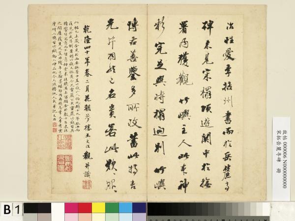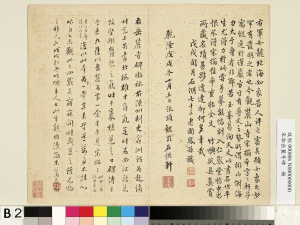 右軍如龍。北海如象。昔人評之審矣。顧如象之妙。罕有發明之者也。今觀麓山寺宋搨本。字字軒昂。寓縱逸於謹嚴。方寸有尋丈之勢。所謂排山倒海。力大于身者非耶。昔玉峯葛洵天丈。以書名世。平生尤得力於此。嘗手摹數幅。刻入仁聚堂帖中。尚恨不得宋搨佳本。重拓全文。竹嶼夙具真賞。所藏名蹟甚夥。遭逢抑何多幸哉。戊戌(西元一七七八年)閏月石湖七十三老圃鳳孫識。 |