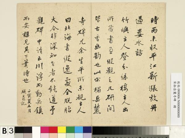 時雨未收。平江新漲。放舟過婁水。訪竹嶼主人。登分綠樓。主人出所藏書畫縱觀之。几研間皆古香幽韵也。此宋榻岳麓寺碑。尤余生平所未覩。主人曰。北海書縱逸處。全脫胎大令。非深知書者不能道。予觀碑中語云。川浮而動。岳鎮而安。想見其下筆時也。壬寅(西元一七八二年)夏五月顧光旭記。 |
