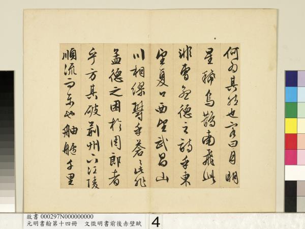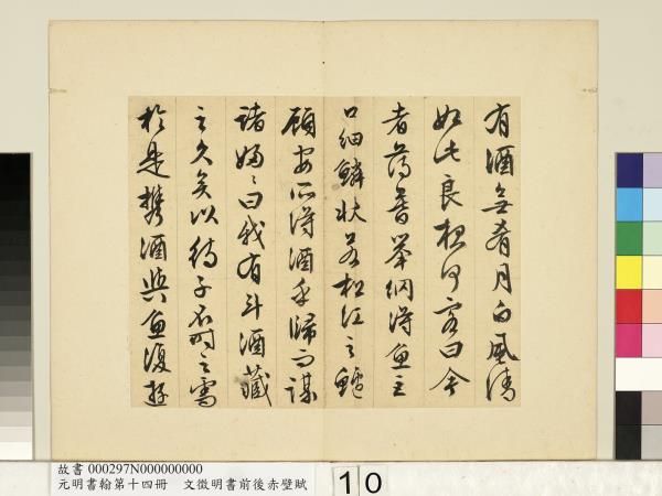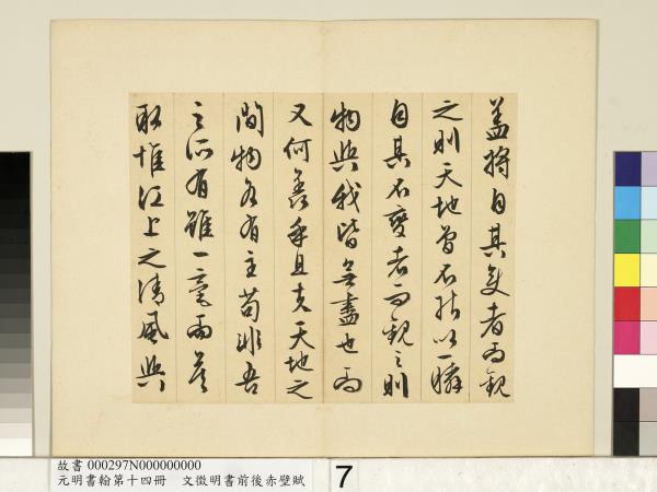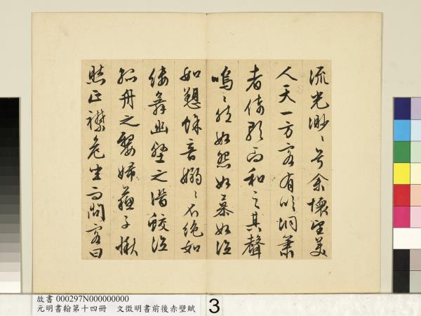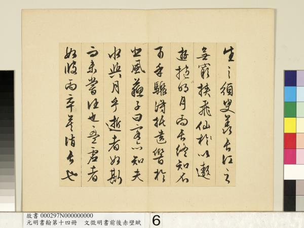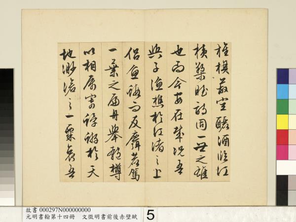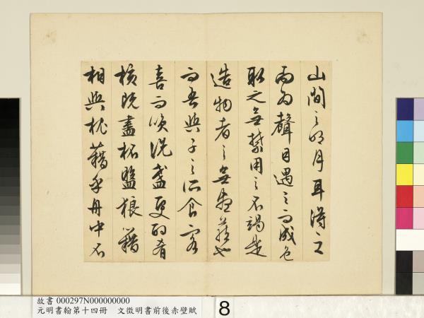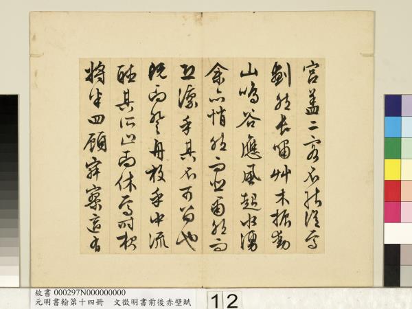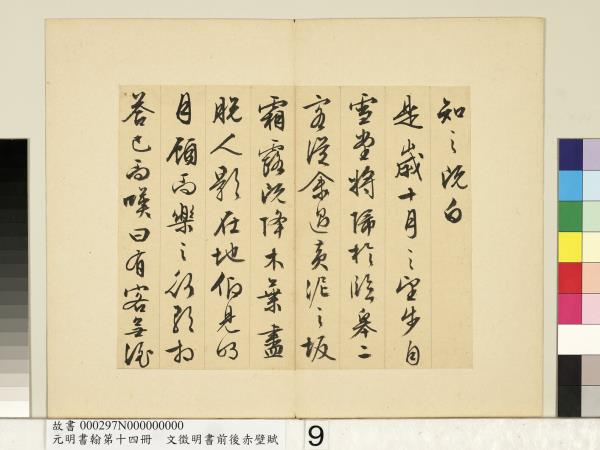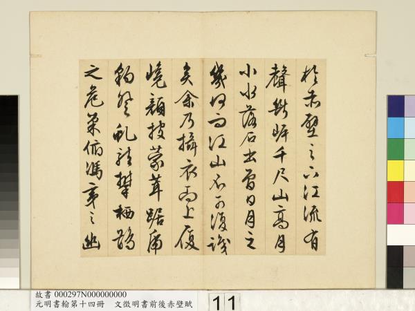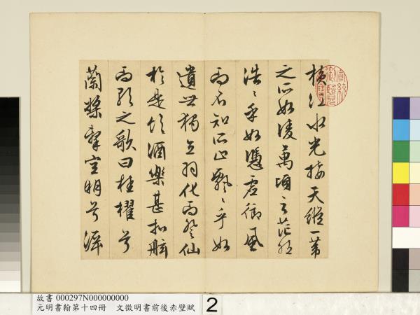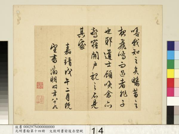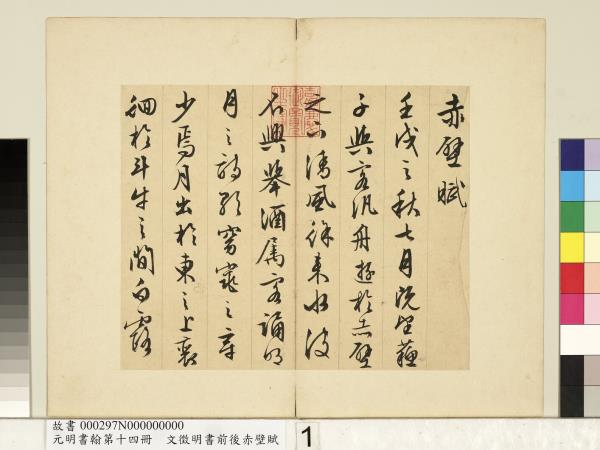 參考書目 吳誦芬、童文娥、譚怡令,〈元明書翰第十四冊 冊 文徵明書前後赤壁賦〉,收入《明四大家特展-文徵明》(臺北:國立故宮博物院,2014.03),頁210-217、338-339。
