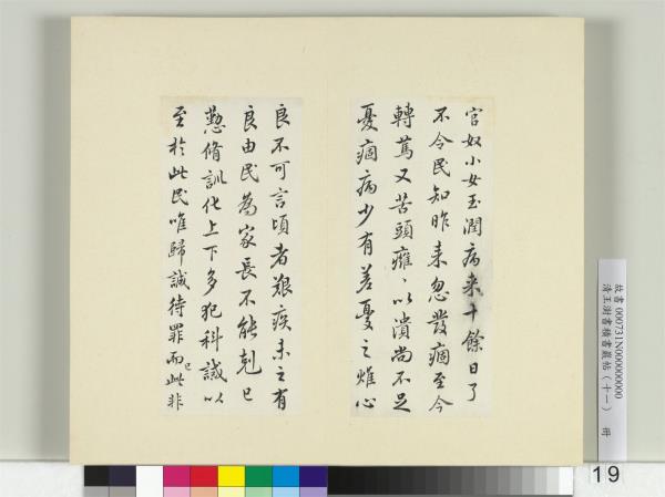 (官奴帖)官奴小女玉潤。病來十餘日。了不令民知。昨來忽發痼。至今轉篤。又苦頭癰以潰。尚不足憂。痼病少有差。憂之焦心。良不可言。頃者艱疾未之有。良由民為家長。不能剋己懃脩。訓化上下。多犯科誡。以至於此。民唯歸誠待罪而已。此非復常言常辭。想官奴辭以具。不復多白。上負道德。下愧先生。夫復何言。(二謝帖)二謝書云。即以七日大斂。冥冥永畢。不獲臨見。痛恨深至也。無復己己。武妹脩載在道。終始永絕。道婦等一旦哀窮。並不可居處。言此悲切。倍劇常情。諸不能自任。未遂面緣。撫念何己。不具。羲之頓首。官奴二謝真跡。明季在新安吳用卿家。余所得宋搨精本。乃毘陵楊氏所藏。玉潤珠圓。下真一等。鬱岡快雪祖刻也。