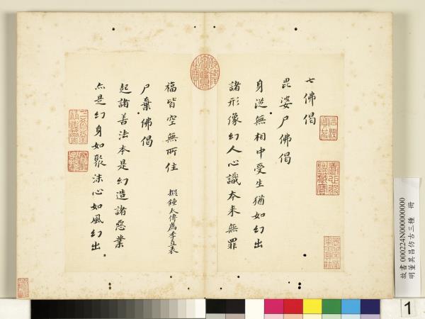 七佛偈。毘婆尸佛偈。身從無相中受生。猶如幻出諸形像。幻人心識本來無。罪福皆空無所住。擬鍾太傅薦季直表。尸棄佛偈。起諸善法本是幻。造諸惡業亦是幻。身如聚沫心如風。幻出無根無實性。擬鍾太傅還示帖。毘舍浮佛偈。假借四大以為身。心本無生因境有。前境若無心亦無。罪福如幻起亦滅。擬鍾太傅力命表。拘留孫佛偈。見身無實是法身。了心如幻是佛幻。了得身心本性空。斯人與佛何殊別。擬右軍黃庭經。拘那含牟尼佛偈。佛不見身知是佛。若實有知別無佛。智者能知罪性空。坦然不怖於生死。擬右軍樂毅論。迦葉佛偈。一切眾生性清淨。從本無生無可滅。即此身心是幻生。幻化之中無罪福。擬右軍曹娥碑。釋迦牟尼佛偈。法本法無法。無法法亦法。今付無法時。法法何曾法。擬大令洛神賦。天啟元年歲在辛酉(西元一六二一年)五月十三。先妣沈孺人忌日。書此偈。願流布世間。一切誦持者。皆悟明本來。紹隆大法。薦資冥福。離苦得樂者。董其昌。
