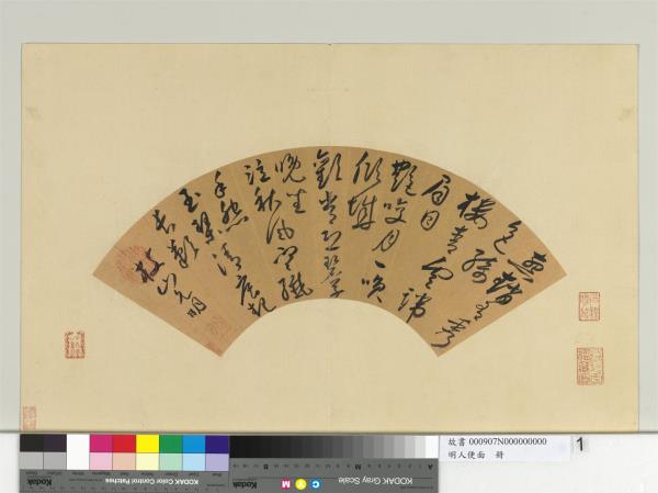 | 參考書目 | 1.何傳馨,〈明祝允明書扇〉,收入何傳馨編,《書法之美特展圖錄》(臺北:國立故宮博物院,1992年五月初版一刷),頁91-92。 |