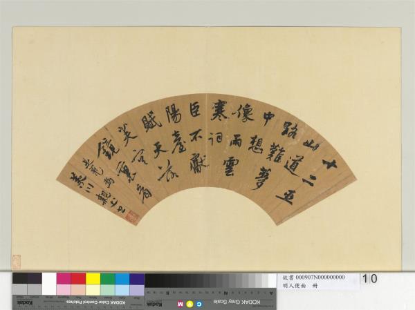 | Description | Mo Shih-lung, a native of Hua-t’ing (modern Shanghai), was considered a child prodigy for his advanced studies at the age of 8 and his ability to compose verse at 10. A Tribute Student, he excelled at poetry, belle-lettres, and research as well as painting and calligraphy. His small standard script was especially refined and his running and cursive scripts were grand and untrammeled. This work was done on gold paper. The brush-work is strong and beautifully flowing as the characters have an upright and elegant quality. This is the 10th leaf from Album of Folded Fans by Ming Calligraphers. |