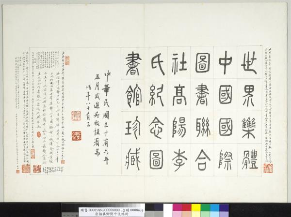 世界高陽等圖書館隨大陸淪陷。恢復尚不知何時圖書大量再集難能。年攜小敖之文獻墨迹與文藝品類。合組為重文館。以多質少量之精華。居兩館之冠。而以重文名之。此乃亂後之組織也。煜瀛誌于重文館。 |