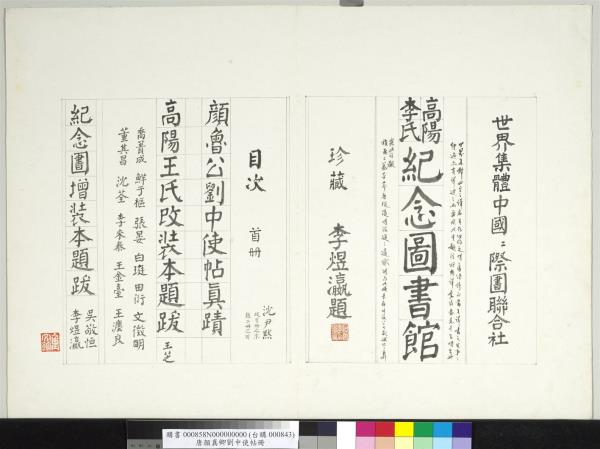 世界集體中國國際圖書聯合社高陽李氏紀念圖書館珍藏。(篆書)。中華民國三十有六年(西元一九四七年)五月武進吳敬恆署耑。時年八十有三。(行書)。 |