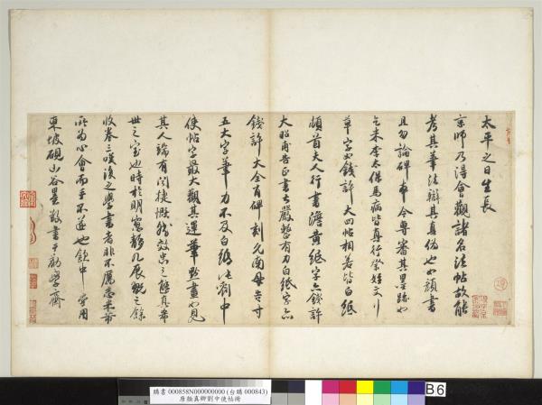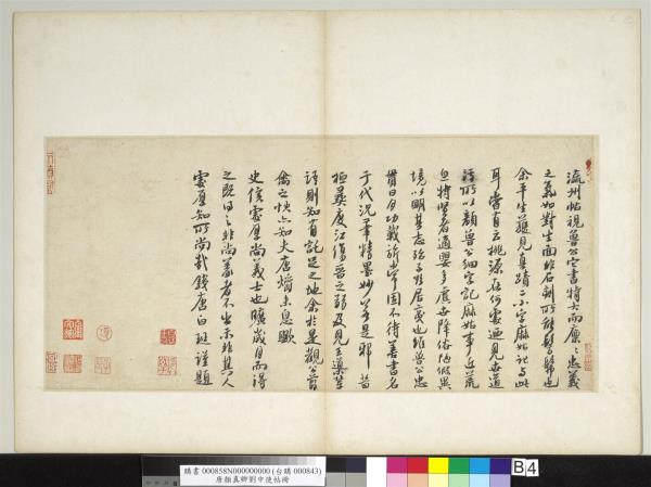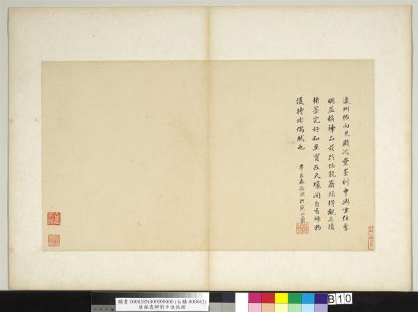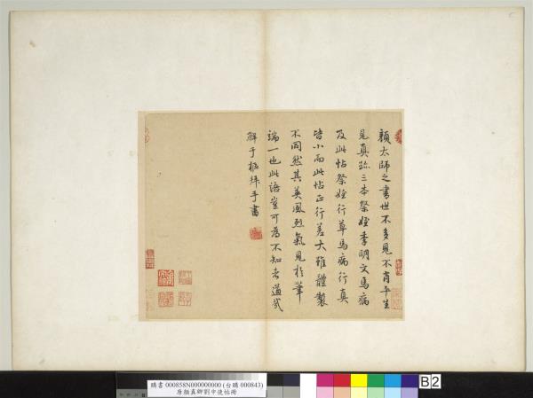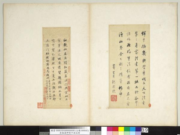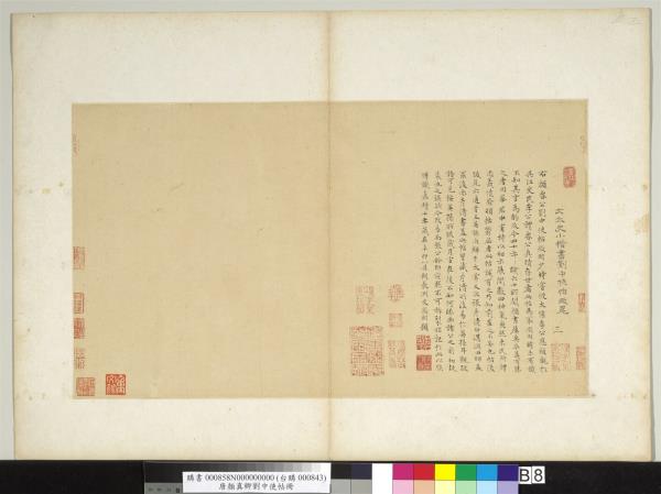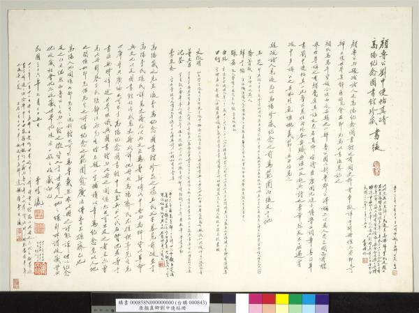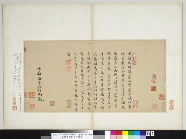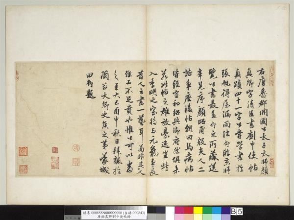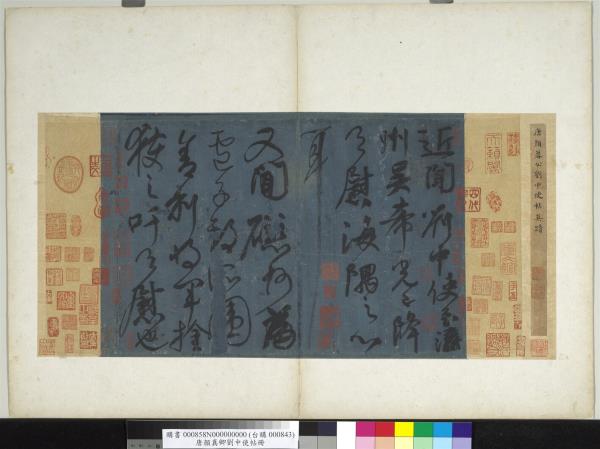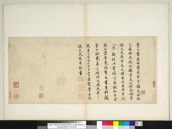 顏魯公劉中使帖真蹟。高陽王氏改裝本題跋。王芝。喬簣成。鮮于樞。張晏。白珽。田衍。文徵明。董其昌。沈荃。李來泰。王金臺。王灋良。紀念圕增裝本題跋。吳敬恒。李煜瀛。 |