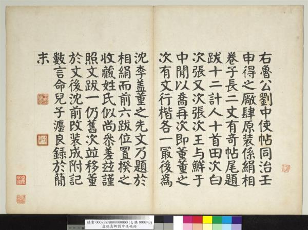 此帖華氏以前收藏。端緒與張丑清河書畫舫所載略同。惟歸張丑一層不能符合。然考白氏跋內示非其人四字為句。文義乃深。而彼刻無非其人三字。又文氏一札付之闕如。其所收之為贗本。已可概見。王虛舟竹雲題跋謂錫山秦公子曾見此帖於京師。字大如掌。遂疑董氏鴻堂所刻字形差小。與秦所見不同。不知鮮于太常明言此帖正行字較馬病。季明差大則如掌之說。特約略言之耳。獨文氏以王英孫跋宜在後。不應出諸公之前。為不可解。謹按王跋於至元丙戌(西元一二八六年)。乃元世祖之二十三年。非順帝至元也。蓋順帝辛巳即改元至正。是以順帝至元無丙戌年。且如文氏所云。則是此帖於大德九年乙巳(西元一三0五年)藏張彥清。所歷四十年。至至元丙戌(西元一二八六年)始易之王英孫。何以蒙城田衍於至大己酉中秋拜觀於蘭谷大卿史侯之第乎。然而文氏之跋此帖。審重低回。用心亦良苦矣。豈張繡江之即張彥清。非後學寡聞單見所能知耶。至此帖輾轉市廛三年莫售。余乃排群議而收之。是不可解者。又不獨文氏一跋也。同治癸酉(西元一八七三年)六月九日識於阿所好齋。 文跋內案英孫所跋云云。蓋誤認張繡江為張晏。因以至元為後至元耳。考繡江元初人。名斯立。字可與。非彥清也。至李跋謂此帖之在戲鴻堂。與坐位季明並稱神品。亦非定評。夫董刻祭姪文誠為可。尚若此帖之刻。與坐位摹本同一失真。何神品之有。而白氏一跋。則有關世道人心文字題跋云乎哉。八月廿九日又記。 帖內兩足慰句。何等痛快淋漓。若作可慰。便嫌不暢。且此足字。與盧八倉曹帖足下之足同一結法。書畫舫鐵網珊瑚均訛。為可真可笑人。光緒五年(西元一八七九年)七月九日。 王良常云。凡古人名蹟。但問佳惡。不論真贗。誠以鐫刻流傳彼此互異。儻無定見。何從折衷。即如近代所刻顏帖。停雲館之祭姪文。與餘清齋筆意不同。戲鴻堂之奉辭帖。與快雪堂字數不同。餘清齋之蔡明遠與快雪堂筆意字數均有不同。然祭姪當以餘清為正。奉辭明遠。當以快雪為正。自不難一目了然。此劉中使帖。初見於戲鴻堂刻。已為良常所言几。嗣又刻之曾氏滋蕙堂。亦與真蹟不類。案曾氏初搨本前列有目錄。此帖不在錄中。不知何時增入帖。後名款三字。係從劉太沖敘摹入。尤可笑人。近見賈人持有此帖一卷。用油素鉤。自戲鴻堂。其真贗佳惡。則又不必辨矣。己卯秋日金臺。王虛舟先生未見此帖真蹟。便知戲鴻堂刻之失真。余既見此帖。益信虛舟先生眼高於頂。余出此帖示客。必並示以戲鴻堂而卒。未有別白之者。抑又何耶。己卯重陽前一日。 華亭尚書書中董狐。嘗短王著以倣書入石。其所刻戲鴻堂帖。自當精加鑒別。不使王著在地下笑人。特鉤摹假之。他人草率不免耳。劉中使帖。既經摹入。自無可疑。況此紙結構神(點去。遠)明遠。出董刻上乎。同日又記。 此紙羣以為贗。余未親見魯公執筆。不敢謂其不然。然魯公名蹟。傳刻至今者。除座位稿。祭姪文。劉太沖敘外。他如修書守政江外文殊廣平草篆明遠送書等帖。均不若此沈雄鬱勃一氣盤旋。是此紙為魯公手書。已無疑義。他日儻更見廬山真面此紙之贗。確然可證。余亦必不固執前言。不然。則嗜痂之誚。燕石之譏。所不恤矣。重陽日書。 |