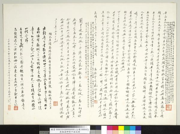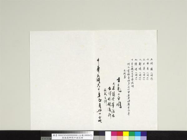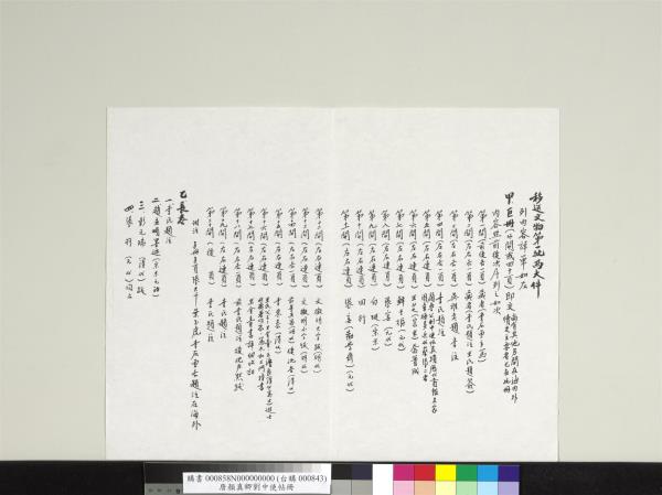 移送文物第一批兩大件。列內容詳單如左。甲。巨冊(廿開或四十頁)即交。尚有其他另開在海內外續交主要者。已在此冊。內容照前後次序列之如次。第一開(前後各一頁)藏者(李石曾手寫)。第二開(左右各一頁)藏者(李氏題注。王氏題簽)。第三開(左右各一頁)吳稚老題李注。第四開(左右各一頁)李氏題注。第五開(左右連頁)顏魯公劉中使帖真蹟。歷代賞鑑名家圖章極多。近代蔡張二者。第六開(左右連頁)。王芝(宋末)喬簣成。第七開(左右連頁)鮮于樞(元代)。第八開(左右連頁)張宴(元代)。第九開(左右連頁)白珽(宋末)。第十開(左右連頁)田衍。第十一開(左右連頁)張宴(勸學齋)(元代)。第十二開(左右連頁)文徵明大字跋(明代)。第十三開(左右連頁)文徵明小字跋(明代)。第十四開(左右各一頁)前董其昌(明代)後沈荃(清代)。第十五開(左右連頁)李來泰(清代)。第十六開(左右連頁)王氏父子。王金臺。王灋良(清代高士)進士。收藏著作家。寫太和三門榜書。第十七開(左右連頁)王金臺書詳細考証。第十八開(左右各一頁)。前李氏題注。後沈尹默跋。第十九開(左右連頁)李氏題注。第二十開(後頁)李氏題注。附注。另冊另頁張大千。葉玉虎。李石曾各題注在海外。乙。長卷。一。李氏題注。二。趙孟頫墨迹(宋末元初)。三。彭元瑞(清代)跋。四。張羽(元代)同上。五。胡儼(明代)。六。林慈(明代)。七。王英(明代)。八。鄒緝(明代)。九。陸琛(明代)。十。李氏題注及重裱說明。附注賞鑑章極多。近代重要者岫廬李氏等及跋略。李煜瀛石曾閱。大略符合。筆誤者當詳校對後列正式文件。中華民國六十年(西元一九七一年)五月廿日。台北。 |