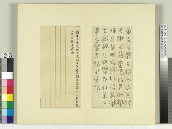 | 釋文 | 有秦嗣王。敢用吉玉瑄璧。使其宗祝邵鼛布忠。告于丕顯大神巫咸及大沈厥湫。以底楚王熊相之多罪。昔我先君穆公及楚成王。是戮力同心。兩邦以壹。絆以婚姻。袗以齋盟。曰枼萬子孫。毋相為不利。親卬丕顯大神巫咸大沈厥湫而質焉。今楚王熊相康回無道。淫佚甚亂。宣侈競從。變輸盟制。內之則暴虐不辜。刑戮孕婦。幽刺親戚。拘圉其叔父。置諸冥室櫝棺之中。外之則冒改厥心。不畏皇天上帝。及丕顯大神巫咸大沈厥湫之光烈威神。而兼倍十八世之詛盟。率諸侯之兵。以臨加我。欲剗伐我社稷。伐滅我百姓。求蔑法皇天上帝及丕顯大神巫咸大沈厥湫之恤。祠之以圭玉犧牲。逑取吾邊城新隍及於長辛。吾不敢曰可。今又悉興其眾。張矜意怒。飾甲底兵。奮士盛師。以逼吾邊競。將欲復其凶迹。唯是秦邦之羸眾敝賦。鞟䩱棧輿禮使介老將之以自救。殹亦應受皇天上帝及丕顯大神巫咸大沈厥湫之幾靈德。賜克劑楚師。且復略我邊城。敢數楚王熊相之倍盟犯詛諸石章。以盟大神之威神。(篆書)。雍正五年(西元一七二七年)歲次丁未冬十有二月朔旦。良常王澍。摸於錫山鳳光橋東寓舍。詛楚文。世有三石。董廣川云。初得大沈湫文於郊。又得巫咸文於渭。最後得亞駞文於洛。其辭盡同。惟所以質于神者。則隨其號以異。此其祀巫咸文也。歲久刓弊。廣川氏據舊本補完之。余借得錫山秦氏所藏文待詔本。與絳汝二帖所刻校勘。豪毛不異。因據文氏本摸之。筆法簡古。在大小篆之間。其篆法將變時書歟。丁未(西元一七二七年)十二月既望。(楷書)。 |