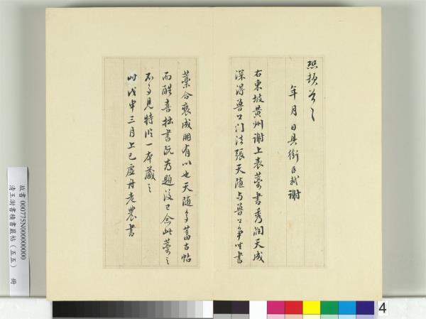 | 釋文 | (臨蘇軾黃州謝上表)臣軾言。去歲十二月廿八日。准勅。責授臣檢校水部員外郎黃州團練副使。本州安置。不得令書本州公事。臣已於今月一日到州訖者。狂愚冒犯。臣軾誠惶誠恐。頓頓首首。伏念臣早緣科第。誤辱縉紳。親逢睿哲之興。妾有功名之意。亦嘗賜對殿(殿點去)便殿。考其所學之言。試守三州。觀其行事之實。而臣用意過當。日趨於迷。賦命衰窮。天奪其魄。叛違義理。辜負恩私。茫如醉夢之中。不知言語之出。雖至仁屢赦。而眾議不容。按罪責情。固宜伏斧鑽於兩觀。推恩屈法。猶當禦魑魅於三危。豈謂尚玷散員。更叨善地。投畀麏鼯之野。保全樗櫟之生。臣雖至愚。豈不知幸。此蓋伏遇皇帝陛下。德刑並用。善惡兼容。欲使法行而知恩。是用小懲而大戒。天地能覆載之。而不能容之於度外;父母能生育之。而不能出之於死中。伏惟此恩。何以為報。惟當蔬食沒齒。杜門思愆。深悟積年之非。永為多士之戒。貪戀聖世。不敢殺身。庶幾餘生。不為棄物。若獲盡力鞭箠之下。必將捐軀矢石之間。指天誓心。有死無易。臣無任瞻。天戀聖感涕澉切之。至經奉表稱謝以聞。臣軾誠惶誠恐頓首之。年月日具銜臣軾謝。(自識)右東坡黃州謝上表藁書。秀潤天成。深得魯公門法。張天隨與魯公爭坐書藁。合裝成冊。有以也。天隨多蓄古帖。而酷喜拙書。既為題後已。念此藁之不多見。特臨一本藏之。時戊申(西元一七二八年)三月上巳。虛舟老農書。 |