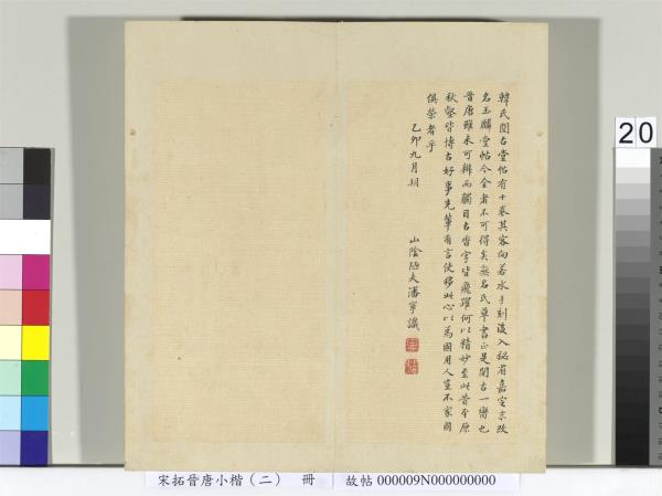 | 題跋 | 潘寧 印記 | 本幅 | 乙卯(西元一七三五年)九月朔。山陰陋夫潘寧識。 | 行楷書 | 韓氏閱古堂帖有十卷。其客向若水手刻。後入祕省。嘉定末。改名玉麟堂帖。今全者不可得矣。無名氏草書。正是閱古一臠也。晉唐雖未可辨。而觸目古香。字皆飛躍。何以精妙至此。昔平原秋壑。皆博古好事。先輩有言。使移此心以為國用人。豈不家國俱榮者乎。乙卯(西元一七三五年)九月朔。山陰陋夫潘寧識。 | ||||||