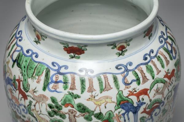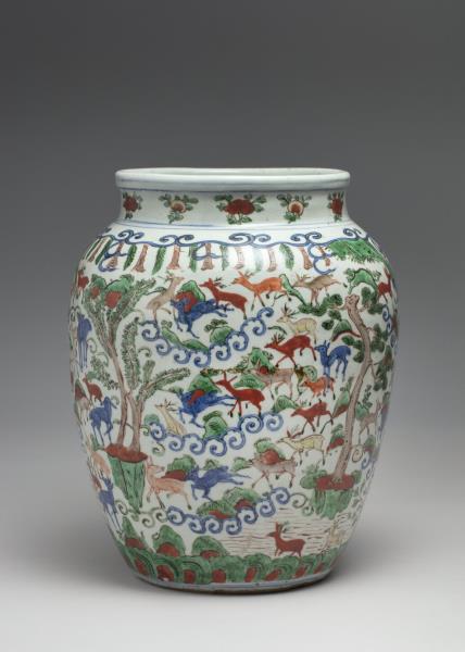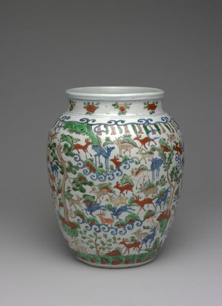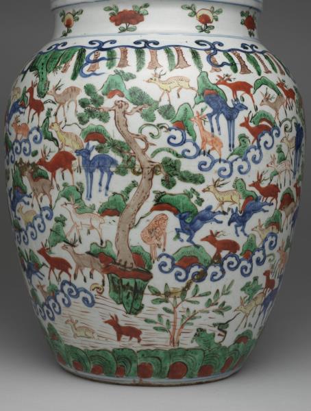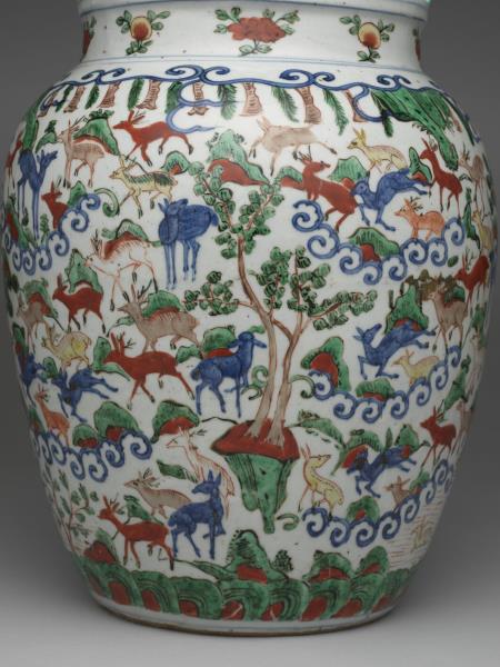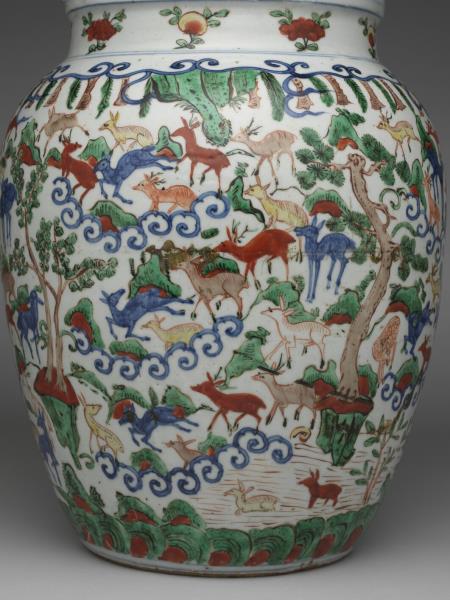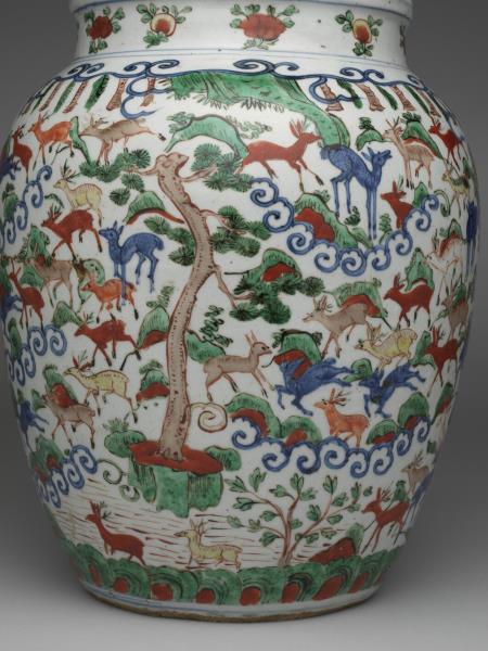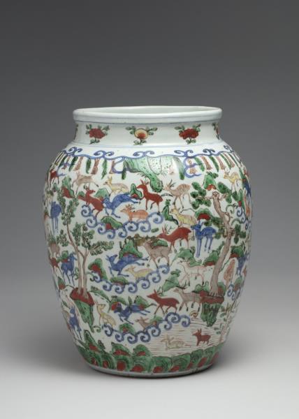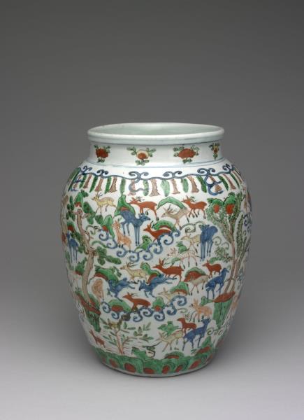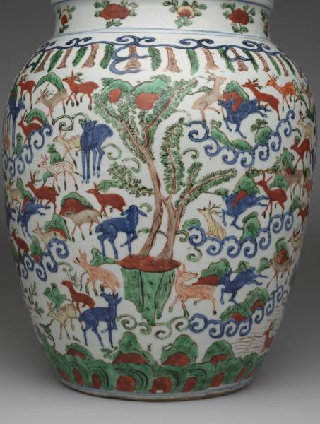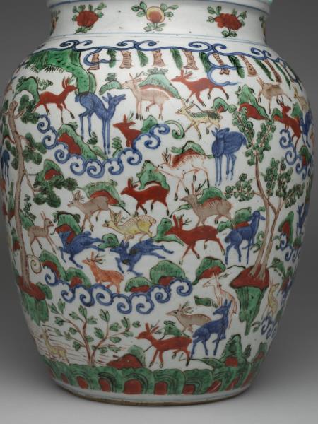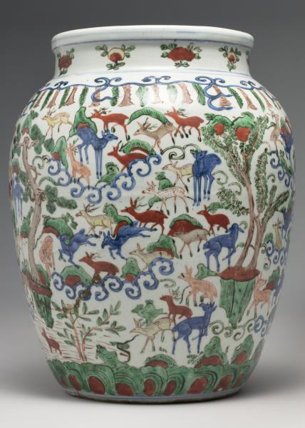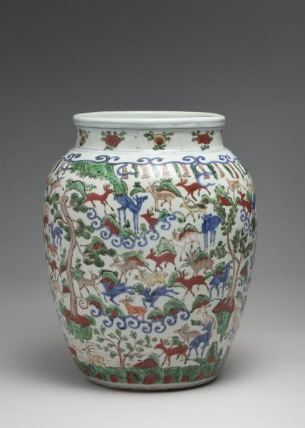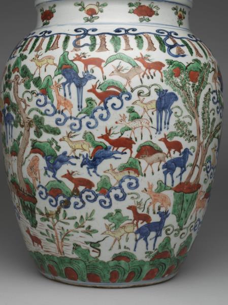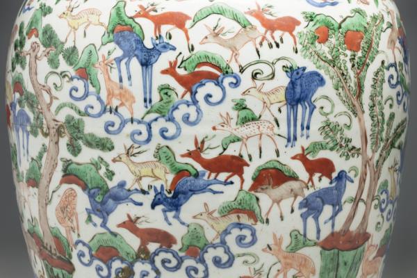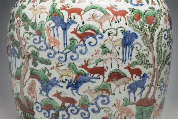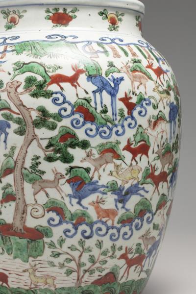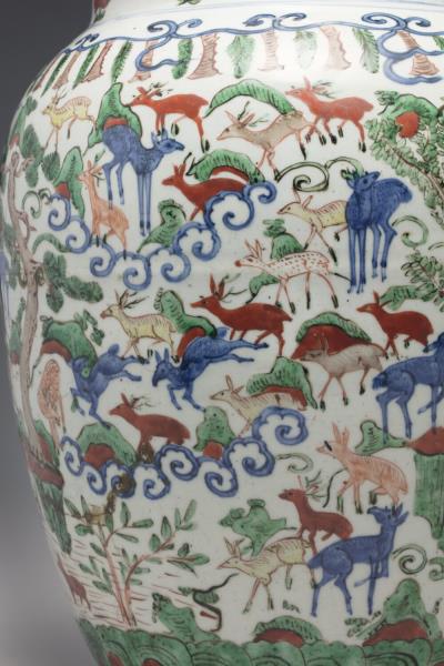 百鹿尊唇口,略侈,短直頸,緩弧肩,碩腹,腹略內收,平底。口沿飾青線兩道,頸部裝飾以間替出現的折枝朵花及桃實紋。肩部繪青花雲紋,並垂飾有褐、綠二色相間的飄帶紋。中央主紋於岩石、草叢、林木、雲朵之間,滿繪五彩群鹿八十九頭。近足底處並加飾有或為土地的圖案紋一周,紅綠相映,熱鬧非凡。罐底露胎,僅在中央凹陷處上釉,並以青花書「大明萬曆年製」楷體款識。萬曆時瓷器燒造量大增,朝廷為此花費甚鉅。主要製品除了延續前期官窯的典範風格外,在器形、紋飾及裝飾技法上也持續發展,其中,以五彩為代表的各式彩繪盛行,題材經常可見描繪吉祥或仙人等佛、道紋樣。《江西省大志》中即記載了當時朝廷對瓷器器形、件數、裝飾元素的詳細要求,可以推想此時製樣下發的大致情況及規模。其中,萬曆十九年是降發樣式與數量最多的一年,而該年下令燒製的「五彩百鹿永保乾坤罈」很可能是像本件這樣的作品。