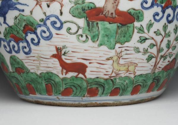 | 說明 | 百鹿尊唇口,略侈,短直頸,緩弧肩,碩腹,腹略內收,平底。口沿飾青線兩道,頸部裝飾以間替出現的折枝朵花及桃實紋。肩部繪青花雲紋,並垂飾有褐、綠二色相間的飄帶紋。中央主紋於岩石、草叢、林木、雲朵之間,滿繪五彩群鹿八十九頭。近足底處並加飾有或為土地的圖案紋一周,紅綠相映,熱鬧非凡。罐底露胎,僅在中央凹陷處上釉,並以青花書「大明萬曆年製」楷體款識。萬曆時瓷器燒造量大增,朝廷為此花費甚鉅。主要製品除了延續前期官窯的典範風格外,在器形、紋飾及裝飾技法上也持續發展,其中,以五彩為代表的各式彩繪盛行,題材經常可見描繪吉祥或仙人等佛、道紋樣。《江西省大志》中即記載了當時朝廷對瓷器器形、件數、裝飾元素的詳細要求,可以推想此時製樣下發的大致情況及規模。其中,萬曆十九年是降發樣式與數量最多的一年,而該年下令燒製的「五彩百鹿永保乾坤罈」很可能是像本件這樣的作品。 |