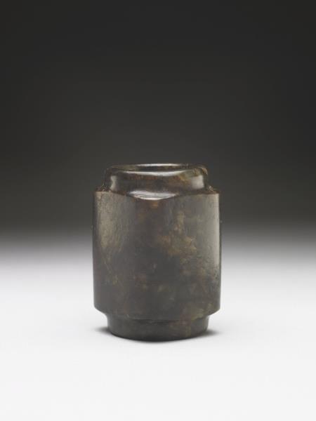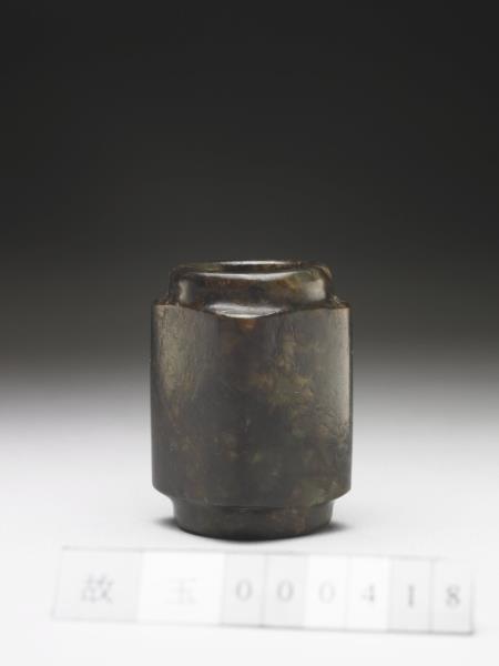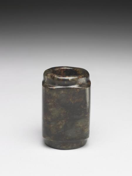 內圓外方的筒形,穿孔上下端有圓形短射口。射口經後世磨改。全器無紋,經沁染成深褐色。