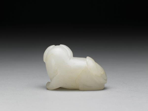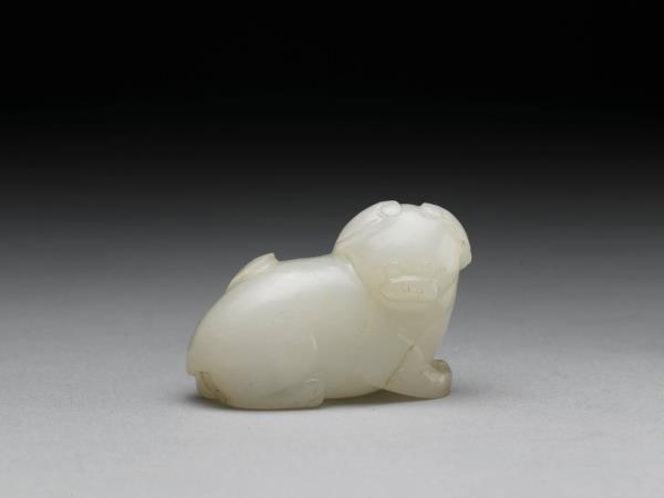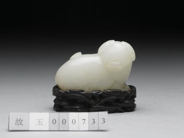 白玉質,琢一犬坐臥回首狀,線條簡單,形體圓潤。帶鏤空雕花木座一只。