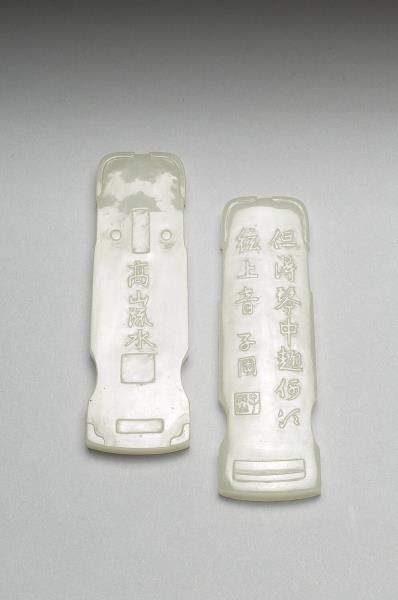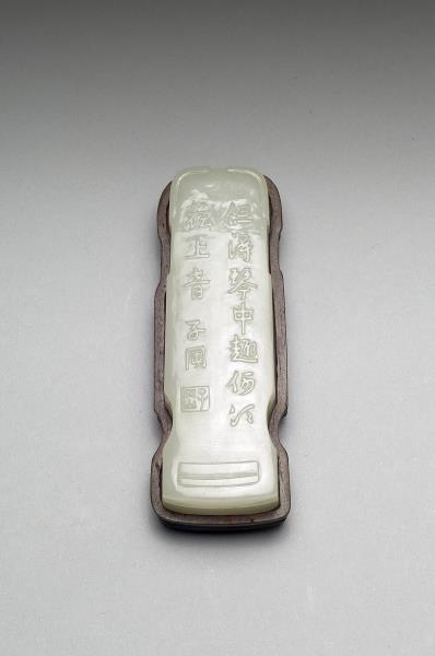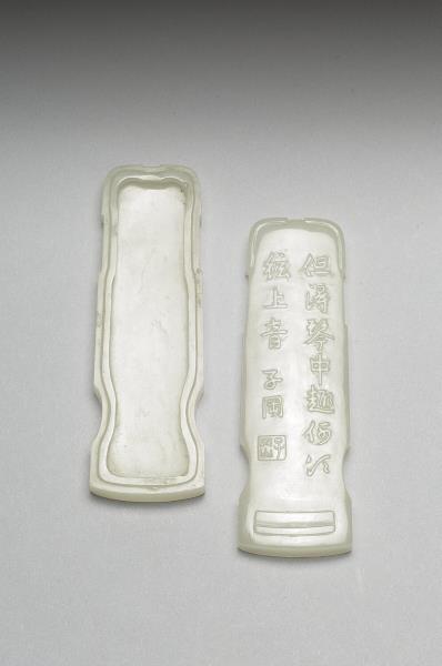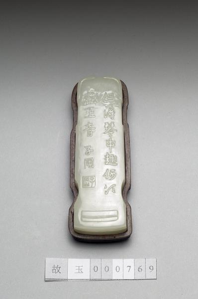 | 說明 | 青玉質,全器琢成古琴造型,平頂,子母口蓋。蓋頂刻有「但得琴中趣,何須弦上音」詩句,落款及刻印「子岡」,盒身為子母口,底部有音孔狀之方形凹入,四形足,中央刻有「高山流水」字樣。附一同形之四足木座。 |