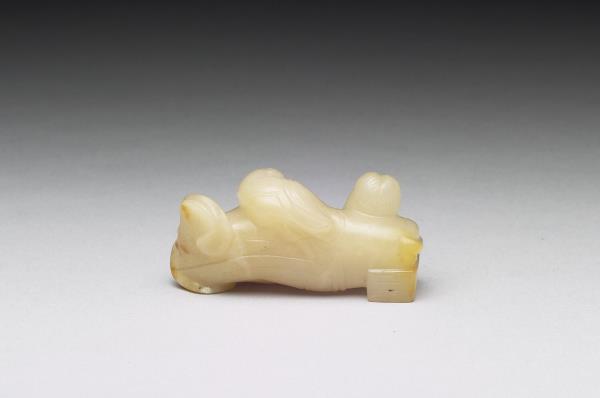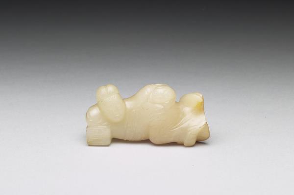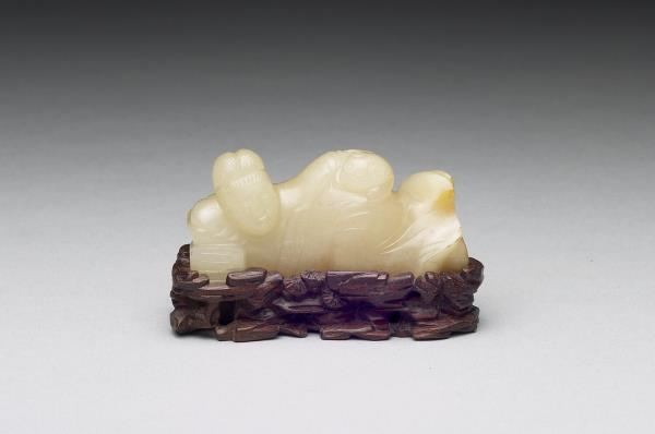 青玉質,部分略泛黃。琢成一人向右躺臥狀,右手曲起枕於頭下,下方有一疊書為枕,左手平伸至臀部,撫一小獸,左腿向前彎曲,膝至小腿著地。附一鏤空雕花木座一只。