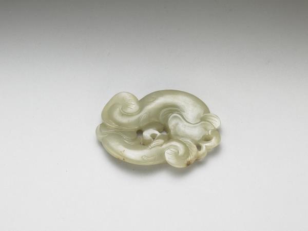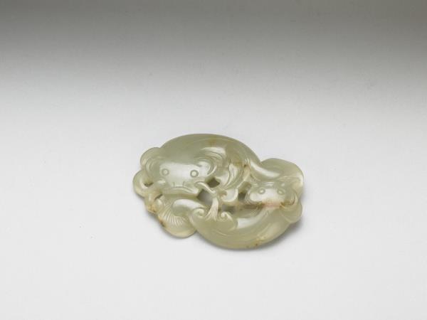 青玉質,部分泛黃。琢雙鯰,兩者曲身頭尾相連 ,鯰鬚為如意雲形。附葵花紋橢圓形木座一只。