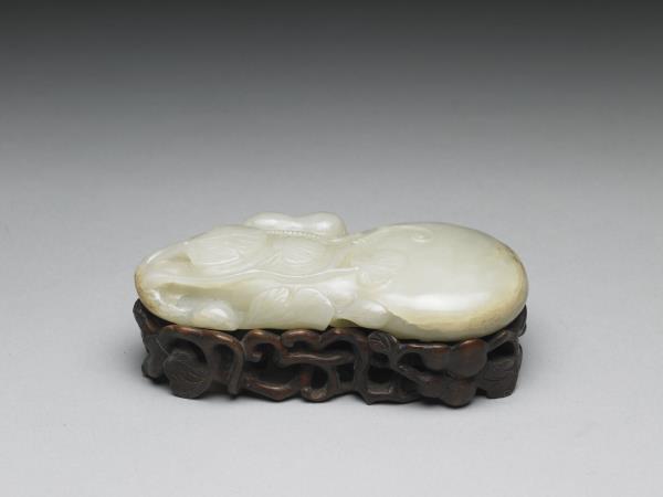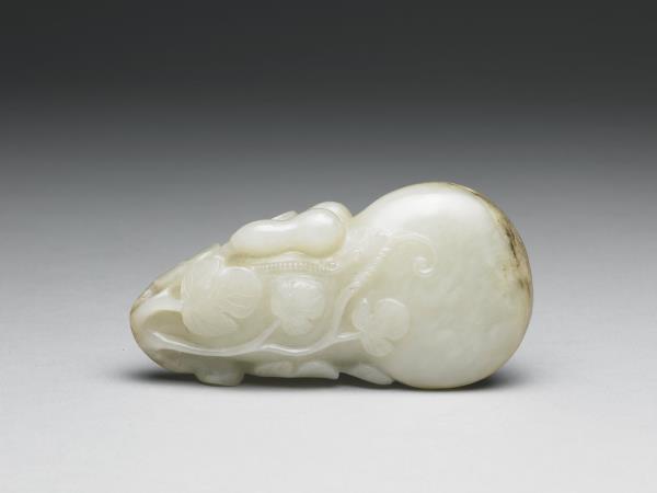 白玉質,全器呈葫蘆形,一側雕瓜藤葉,一側雕有兩個小葫蘆。玉質溫潤。附鏤空葫蘆藤紋木座一只。