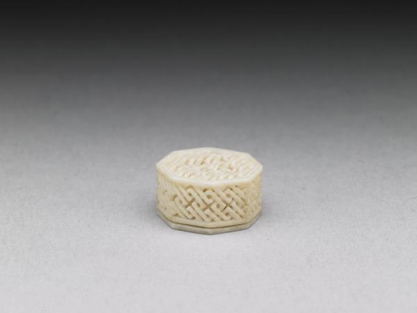 | 說明 | 八角形象牙小盒,器壁鏤雕盤長紋,內裝兩隻象牙小動物,為象牙長方套盒中的一件。套盒全器共十一個象牙盒,其中大小形狀不同的十個小盒,皆需裝入最大盒中,十個小盒或附果盤,或連鏈附動物、瓜果,或僅連鏈而以鏤空葫蘆形小牙飾、磬形小牙飾連接,形形色色,不一而足;其中有數個小盒之蓋面、器身飾鏤空活紋。最大盒器身底面陰刻填黑楷款:「乾隆己未巧月,小臣黃振效恭製。」乃在乾隆四年七月完成的作品,原為「『集瓊藻』多寶格」中的文玩之一。黃振效這種連鏈、活紋小盒(尤其是套盒)乃廣東牙匠的絕活,實可謂集精鏤細刻之極致。 |