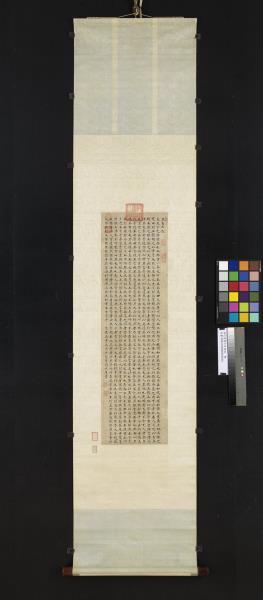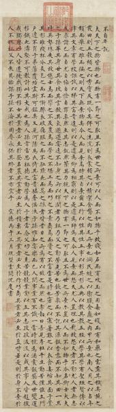 Shen Du (style name Minze), a native of Huating (modern Shanghai), entered the Hanlin Academy in the Yongle era (1403-1424) based on his talent in calligraphy. The elegant technique and beautiful form of his style was greatly admired by the Yongle Emperor. This work, done in 1426 at the Chinese age of 70, is an essay on self-perseverance, promoting the virtues of diligence, remembering the past, and encouragement not to give up. Shen Du’s use of refined standard script along with marking lines give the feeling here of precision and regulation. However, the exposure of the brush tip as it was lifted from the paper created elongated flicks, giving the characters a grace and airiness that lightens and enlivens the more solemn nature of this work.(20091015)