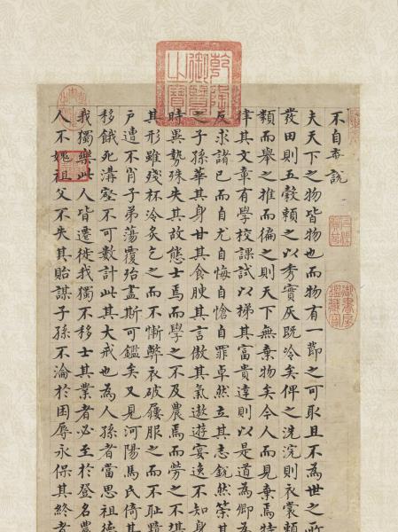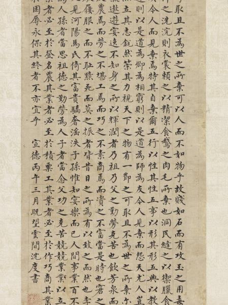 這幅字是七十歲所書,內容是一篇議論文,勸戒世人,要勤勞克苦,飲水思源,不可自暴自棄。沈度以精秀工整的楷書書寫,令人有嚴謹不茍的感覺,不過起筆帶轉鋒,捺筆拉長,流露出委婉曼妙的姿態,沖淡了過於嚴肅的氣氛。