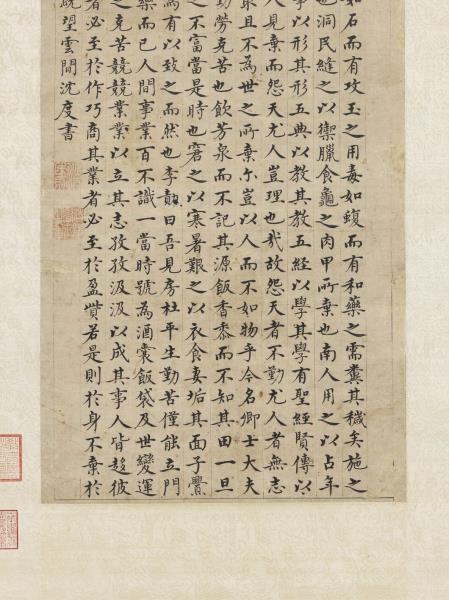 此幅為沈度七十歲所書,內容是一篇議論文,勸戒世人要勤勞刻苦,飲水思源,不可自暴自棄。以精秀工整的楷書書寫,嚴謹不苟,不過起筆帶轉鋒,捺筆拉長,流露出委婉曼妙之姿,沖淡了嚴肅的氣氛。(20091015)