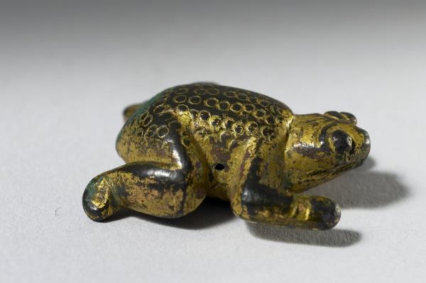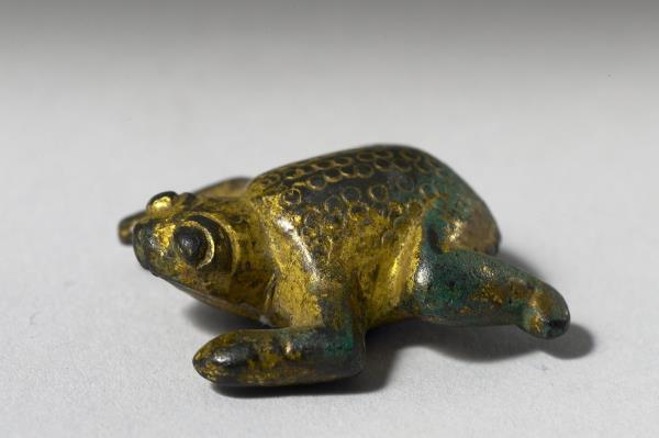 鎏金銅蛙,四肢彎曲,趴伏於地。蛙首微抬,配合圓睜的大眼,狀甚可愛。背部滿布近直線排列的陰線圈點紋,可能是為了模擬青蛙身上條紋的效果。