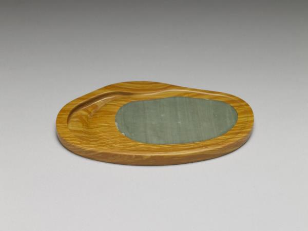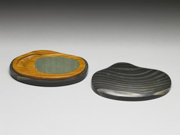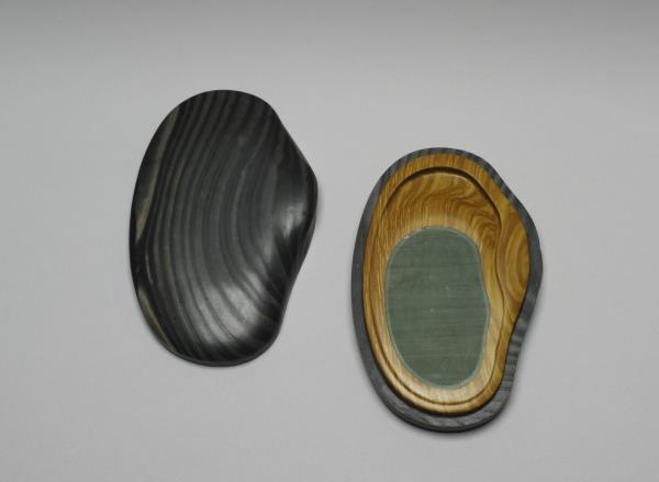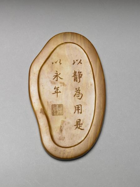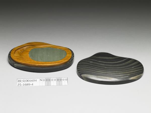 | 說明 | 蚌式土黃色石硯,石質滑潤,通體有深淺不同土黃色紋理。全器琢成一長蚌形,硯面嵌一片不規則長橢圓形綠色松花石作墨堂,綠色石片有深淺不同天然橫紋,周緣一圈打磨光滑,餘皆留下較粗面以受墨。弧形池。硯背周緣起寬棱,中央凹下處陰刻行書銘:「以靜為用,是以永年。」並陰刻二行篆體方印:「康熙宸翰」。蚌式黑色硯盒,全器琢成一長蚌形,通體有黑與灰交錯紋理,黑色紋尚稍微突起。盒蓋與盒身藉硯身扣合。 |