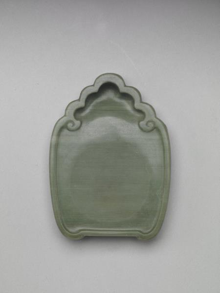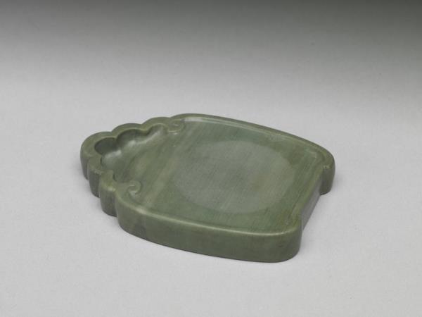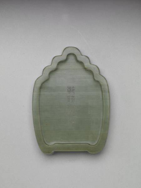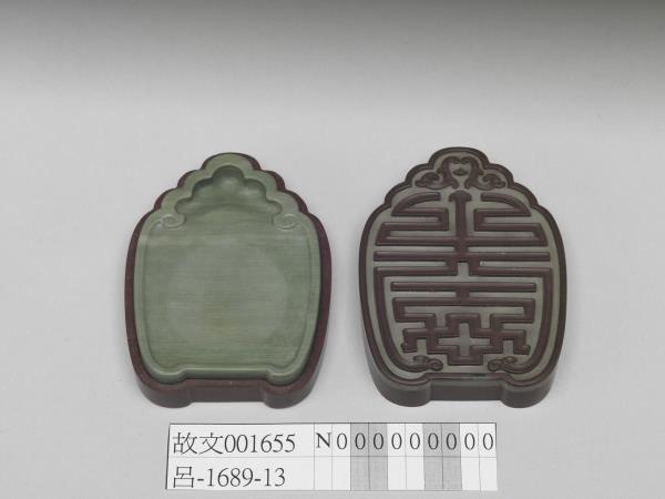 | 說明 | 綠色如意首形硯,周緣起棱,硯首成五曲形。曲邊弧形池,下方兩隅飾卷雲紋。石質潤澤,通體有深淺不同天然橫紋。硯面有一較粗的圓形墨堂,餘皆打磨光滑。硯背周緣起寬棱,中央凹下處正中部位陰刻一行四字篆款:「乾隆年製」。紫色如意首形硯盒,盒蓋與盒身藉硯身扣合。盒用紫綠兩層色石琢製而成,盒呈紫色。蓋面紋飾以暗綠色為地,側視有一圈暗綠色層,似青玉帶;巧雕紫色紋飾,周緣雕一細棱,中央浮雕壽字,其下方雕二卍字,盒上緣雕飾二回首變形龍紋。盒背周緣起棱。 |